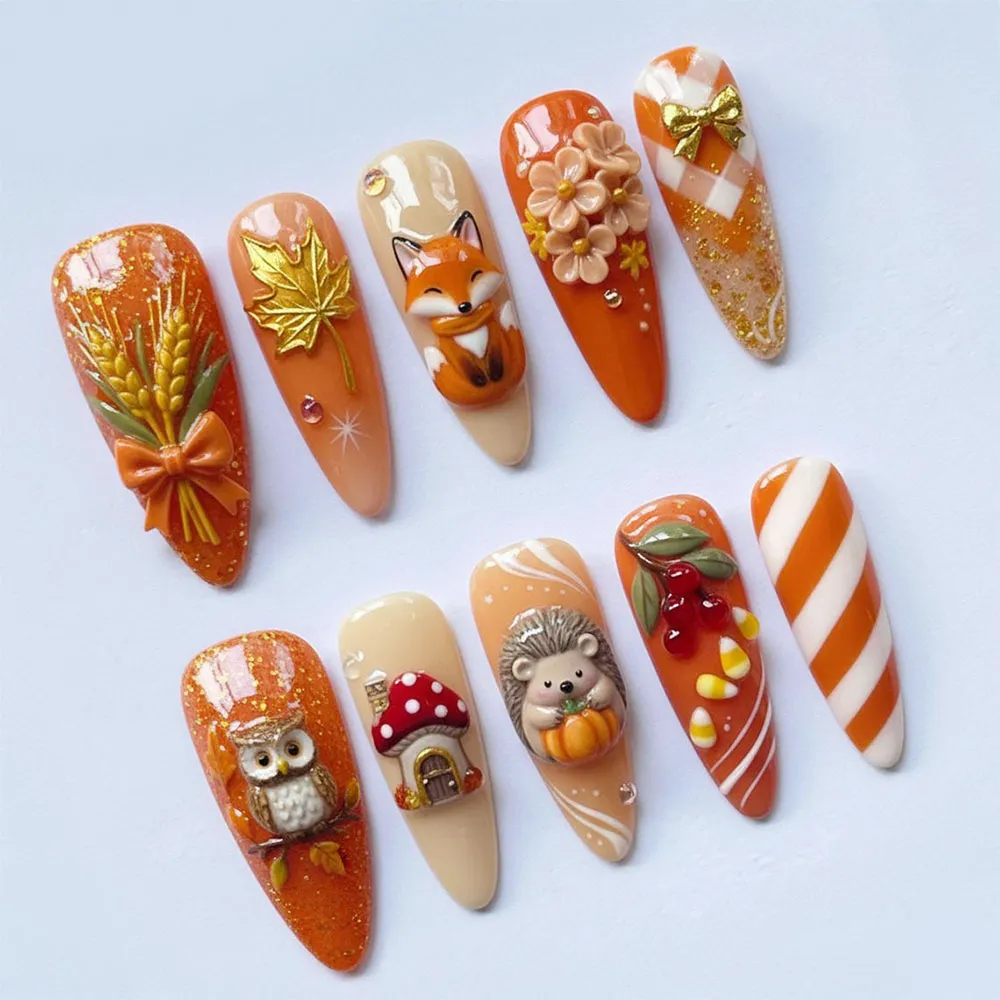 No two nails in this set are alike, and that’s exactly the point. A glittery orange base nail features a 3D sculpted wheat sheaf bundle tied with an orange bow — rustic harvest charm at its finest. A gold 3D maple leaf sits proud on a warm peach base beside a crystal droplet accent, catching light from every angle. The centrepiece nail showcases a hand-painted smiling fox sitting contentedly on a cream base with a crystal teardrop detail — sweet, whimsical, and completely charming. A cluster of 3D blush flowers blooms over a vivid orange base, while a gold 3D bow sits atop a diamond argyle glitter nail for a preppy-meets-festive finish. The second row brings even more delight: a realistic 3D owl perches on a glitter orange branch nail, a mushroom cottage house sits on a creamy beige base, a 3D hedgehog hugs a tiny pumpkin on a swirl nail, 3D cherry and candy corn charms decorate a warm orange base, and a bold orange-and-white candy stripe nail wraps it all up with playful energy. These press on nails are a maximalist autumn dream.