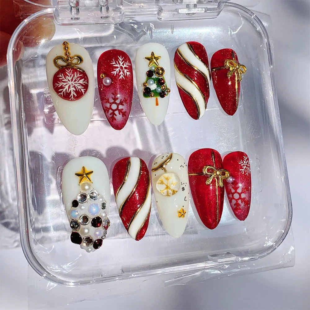 This set is a celebration of Christmas glamour at its finest. The rich red glitter base is paired with creamy white, creating a timeless holiday color story elevated by gold metallic accents throughout. Standout design details include: a dimensional 3D Christmas tree built entirely from mixed gems — sparkling clear crystals, black jet stones, opal white pearls, and iridescent stones — topped with a gold star charm, a red Christmas ornament ball with a white snowflake print hanging from a gold bow charm on a bead chain, red glitter nails with large white hand-painted snowflakes, bold red-and-white candy cane diagonal stripe nails with gold foil lining, a delicate gold bow charm with a pearl center on a glossy red base, a gold snowflake with mini star accents on a sheer white nail, and a white snowflake painted on a deep red glitter nail finished with a gold ribbon bow and pearl detail. Every press on nail in this set delivers maximum impact, combining texture, dimension, and sparkle in perfect holiday harmony.