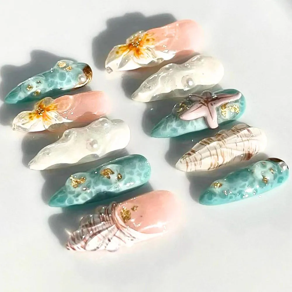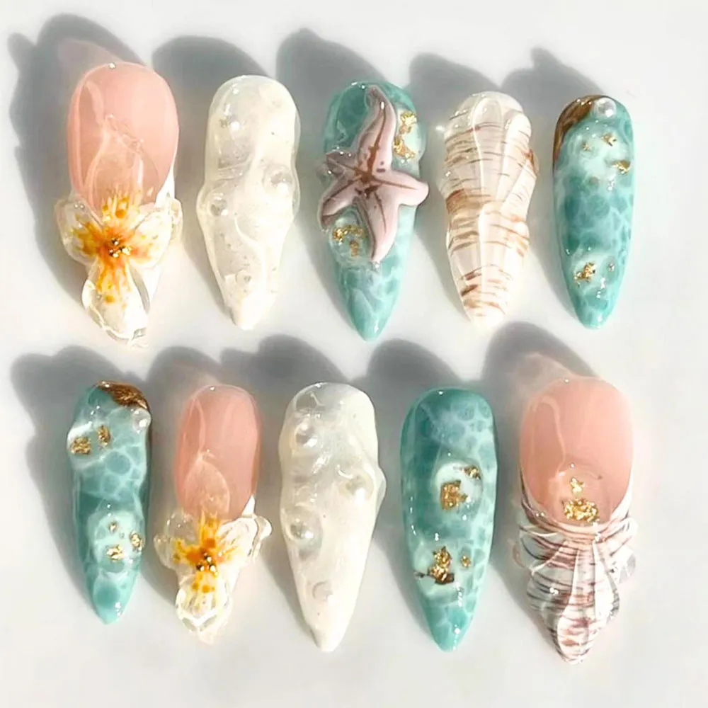 Each nail in this press-on set is a wearable sculpture layered with extraordinary detail. The palette centers around soft peachy pink and dreamy teal green — a combination that feels both earthy and oceanic. A standout translucent white nail features a dramatically sculpted sea foam or coral texture, rising organically off the nail surface with irregular bumps and bubble-like formations that mimic life beneath the waves. A teal ocean water nail with a swirling green marble finish is adorned with a delicate pink starfish and scattered gold foil flakes, while another showcases a naturally striated conch shell texture with warm sandy brown tones and golden leaf accents. A soft peach base nail frames a vivid 3D hibiscus bloom in orange and yellow, its petals fanning out with incredible realism. Gold foil fragments are scattered throughout multiple nails, catching light like sun reflecting off the sea surface. The overall effect is deeply textural, artistic, and unlike any standard press-on set on the market.