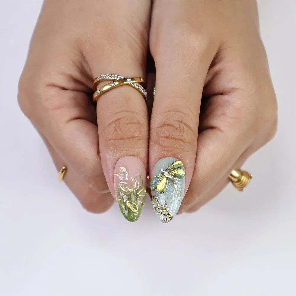 Otherworldly, luminous, and hauntingly beautiful — our 3D Dragonfly Floral Press On Nails are a spring set unlike anything you’ve ever seen. Part fairycore, part fine art, this collection captures the magic of a dewy garden at dawn, frozen in glass and gold.