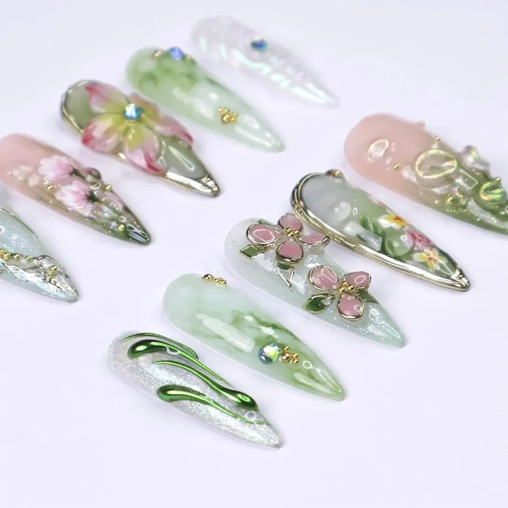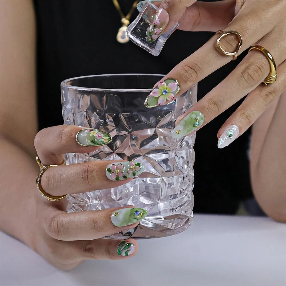 This press on nails set is a mesmerizing study in translucency and texture, built on a shifting palette of sage green, mint, blush pink, and pearlescent white — bases that shimmer and glow like polished sea glass or morning frost. A fine silver-white glitter runs beneath the surface of multiple nails, creating a lit-from-within radiance that catches every angle of light with ethereal depth. The statement nail of the upper row features a 3D dragonfly charm in golden yellow and iridescent wings, perched with delicate wire antennae above swirling aurora glitter and scattered gold bead accents — a breathtaking focal point that blurs the boundary between nail art and wearable sculpture. A bold 3D sculptural flower in deep pink and yellow-green tones is framed within a gold metallic arch on the center nail, its dimensional petals raised and richly painted with gradient color that fades from blush to chartreuse. Hand-painted pink magnolia blossoms on a blush pink base carry a fine-art painterly quality — each petal soft and layered, accompanied by tiny gold stud accents. The aurora swirl nail in pearlescent white with an AB aurora stone is pure glass-skin magic. Chrome green 3D drip details and abstract liquid linework on a glitter sage base give a surrealist, fashion-forward dimension to the lower row. Gold-outlined pink flower charms with rhinestone centers sit atop the mint glitter nail like jewels. Hand-painted yellow and pink spring florals on a green-to-pink ombre base bring warmth and botanical richness. The final blush nail with green-painted foliage and aurora gold shimmer closes the set in a romantic, garden-at-sunset glow — making this collection of fake nails truly complete and breathtaking.