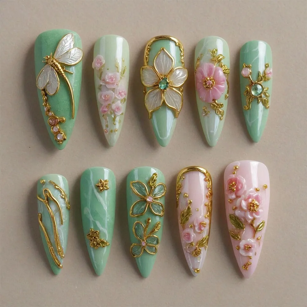 This press on nails set is built on a stunning jade mint green base with a natural stone-like shimmer running beneath the surface, giving every nail the appearance of carved celadon jade — polished, precious, and deeply elegant. Gold metallic detailing runs throughout the entire collection, tying each nail together in a cohesive theme of botanical luxury. The crown jewel of the set is a 3D dragonfly charm in white shell and gold — wings spread wide with intricate translucent veining, mounted on the jade green base with trailing gold wire and pink rhinestone accents below. A 3D sculptural white flower framed in a gold arch with an emerald green center stone takes center stage on the middle nail, the gold outline acting like a gallery setting for this wearable gemstone bloom. A bold 3D pink camellia in full dimensional bloom sits against a jade and white gradient, its layered petals catching light from every angle, paired with gold leaf detailing and a blue aquamarine crystal center. Abstract gold linework — curved, architectural, and confident — sweeps across the jade marble nails on the lower row, accented with tiny gold flower charms. A glass-effect teal flower outlined in gold sits on a deeper jade nail, catching light like stained glass. The final nail shifts to a soft blush pink base where 3D pink rose clusters and gold leaf embossing create a romantic, feminine contrast to the cool jade tones — making these fake nails a truly complete and balanced masterpiece.
