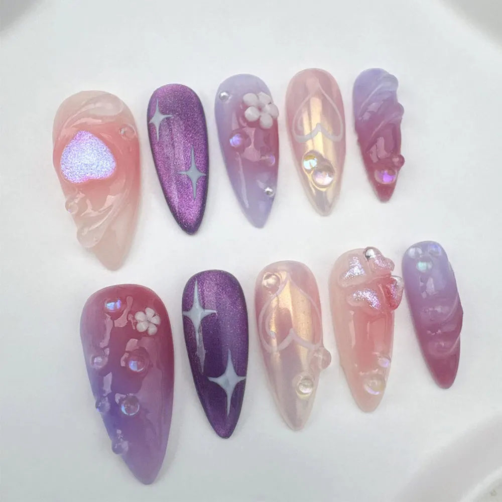 Japanese aesthetic or going all-out glam for a night out, these press-ons pair beautifully with floral dresses, pastel coordinates, or a sleek monochrome party look.