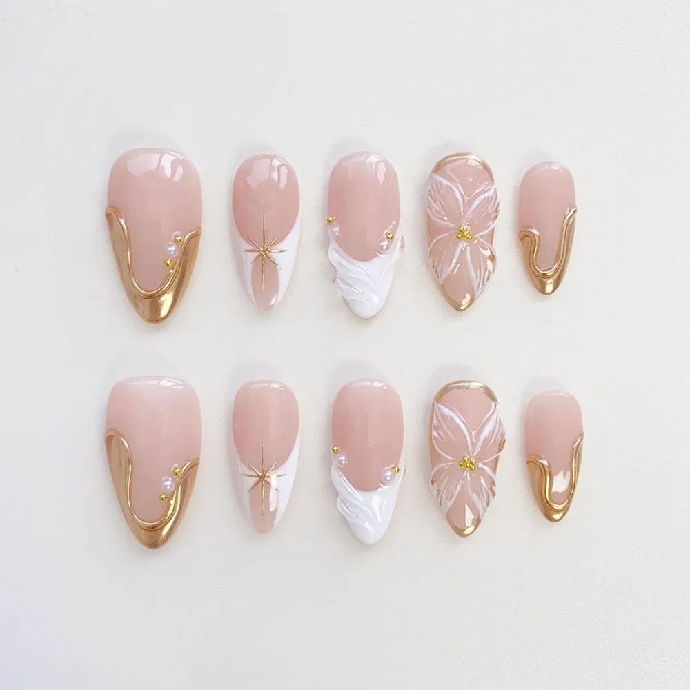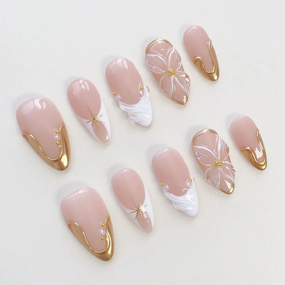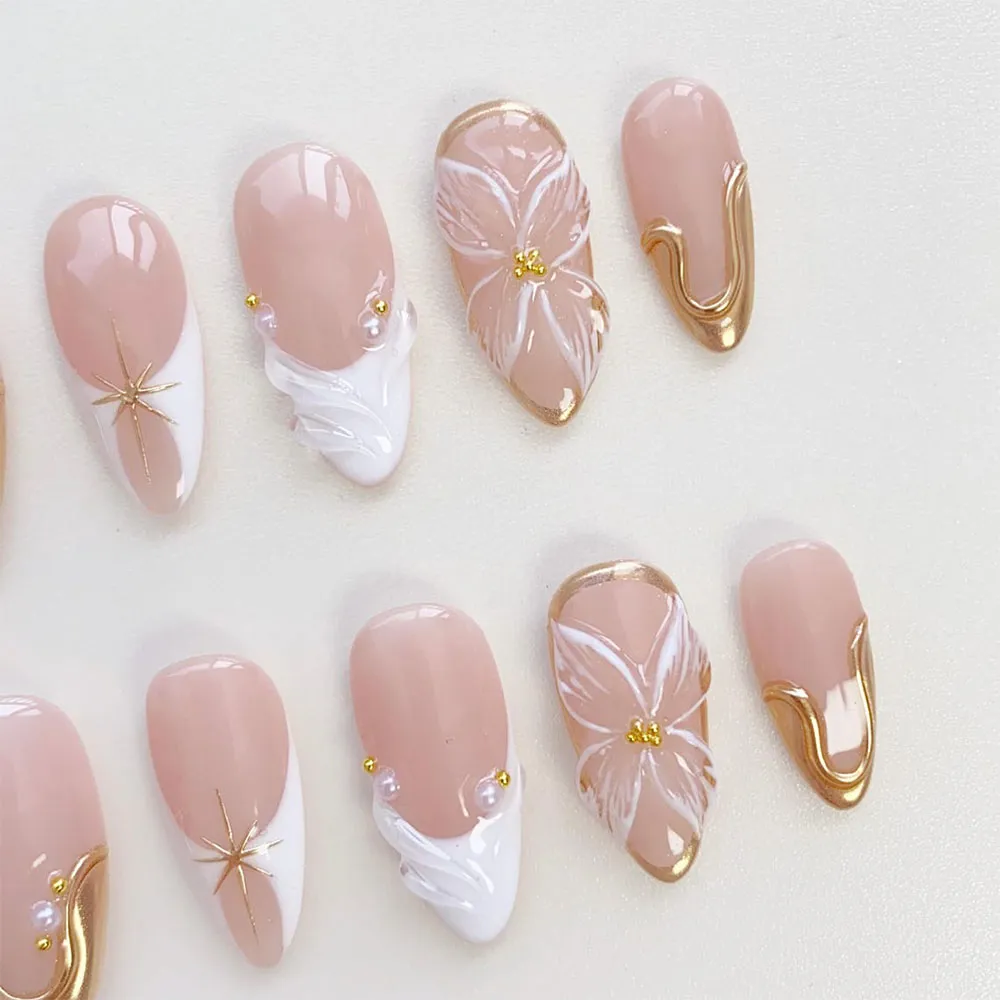 These press-on nails are a perfect match for weddings, bridal showers, birthday celebrations, anniversary dinners, garden parties, or any occasion that calls for a look that is classic, romantic, and touched by gold. Style them with a flowing white bridal gown, a soft champagne dress, a blush pink co-ord, or any outfit that deserves the timeless beauty of French tips elevated with 3D floral gold chrome luxury — these press-ons bring a surge of elegant femininity to every look.