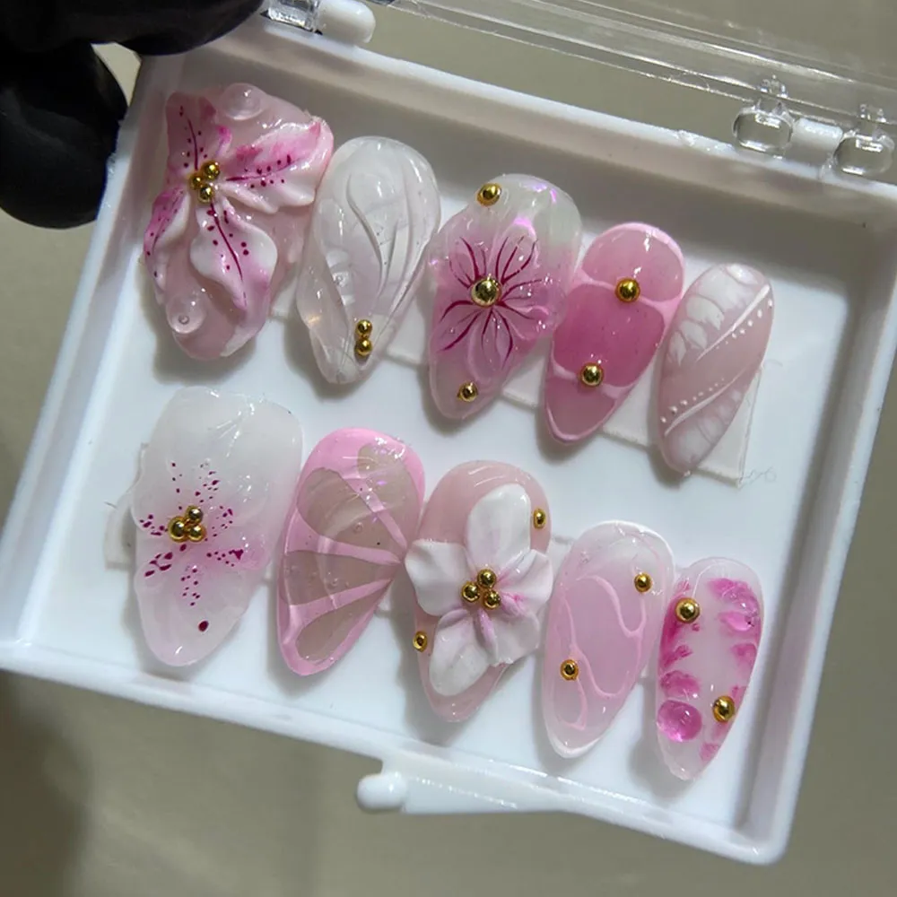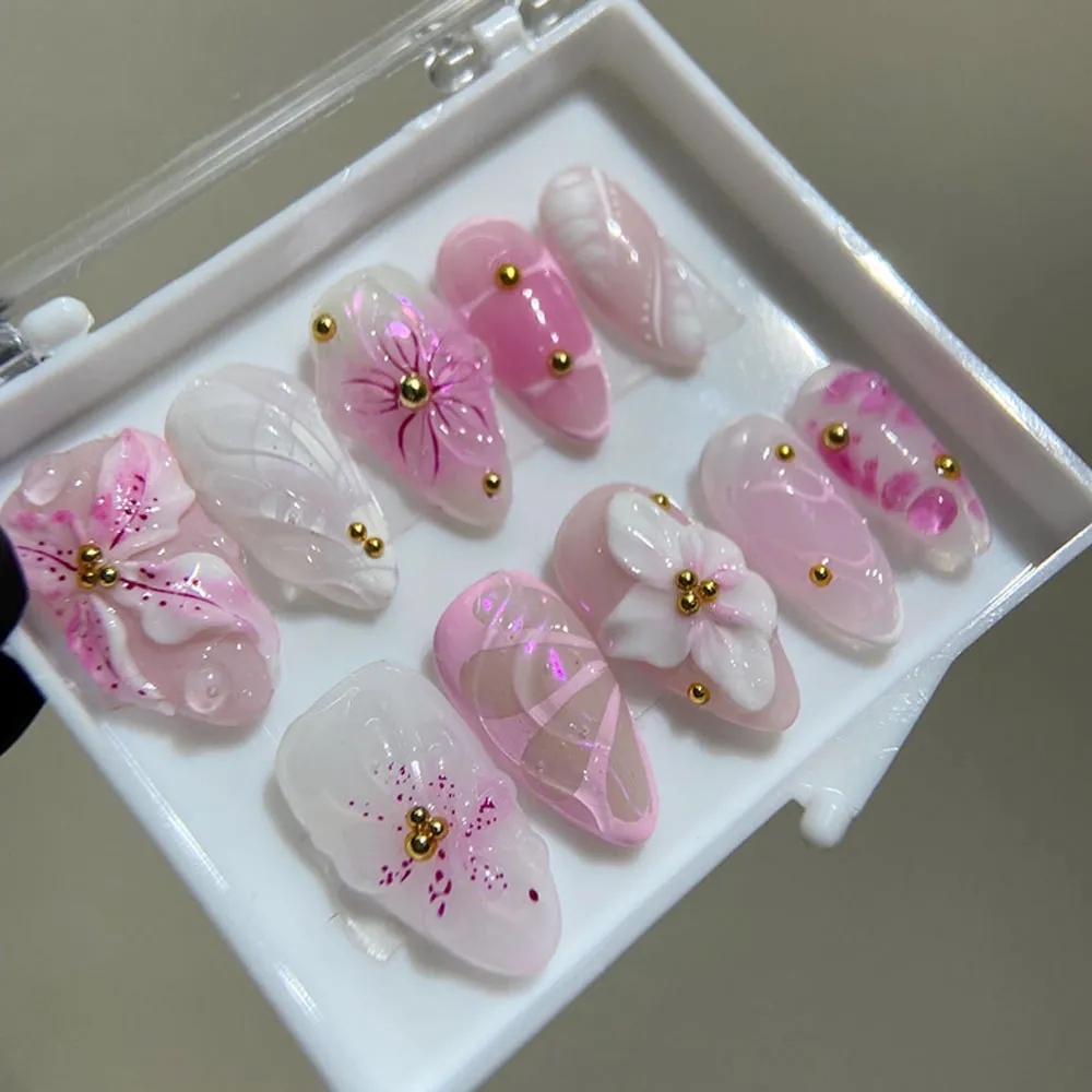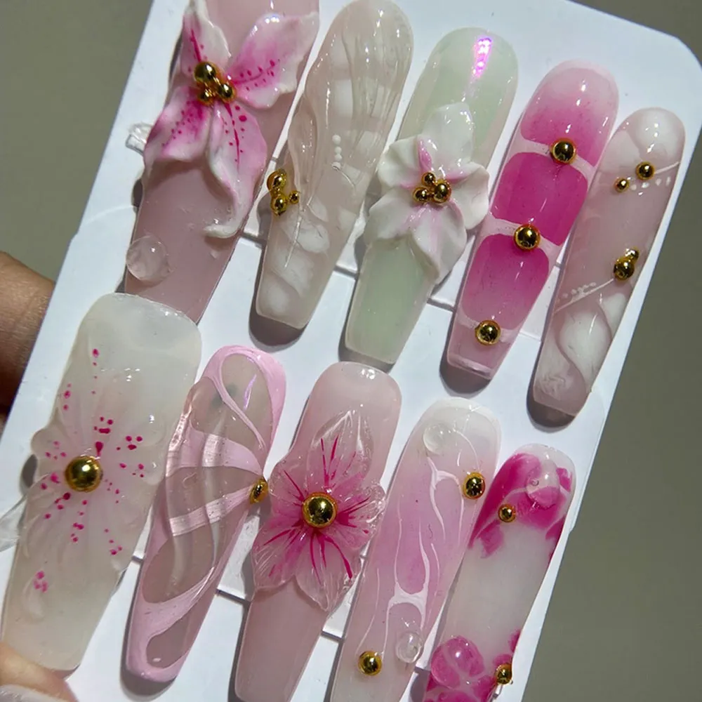 Each set is lovingly handmade with delicate 3D floral sculptures layered over a dreamy pink ombre base that melts from the softest blush to a deeper rosy hue. The gradient effect adds depth and dimension, while the hand-sculpted flowers bring a tactile, luxurious quality that makes these fake nails truly one of a kind. Every detail is crafted with precision and care, resulting in a set of press-on nails that look like they came straight from a high-end nail salon.