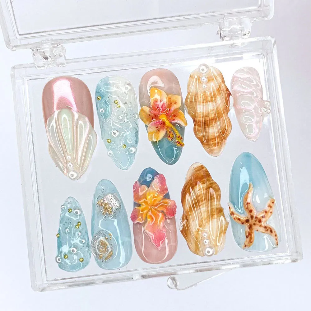 Every nail in this press-on set tells a different story from the sea. The palette blends rose gold chrome, misty aqua blue, soft peachy pink, and warm sandy amber — tones that feel like a golden hour sunset over the ocean. A shimmering rose gold shell fan nail opens the set with an iridescent pearl shimmer finish, its ridges glowing like the inside of an abalone. Two teal aqua nails feature hand-painted white bubble and swirl ocean textures dotted with tiny gold and silver bead accents, creating a dreamy underwater atmosphere. Two bold 3D hibiscus blooms steal the spotlight — rendered in vibrant orange, coral, and yellow, each petal painted with stunning watercolor-like depth and layered directly onto peach and pink-blue ombre bases. Two naturalistic conch shell nails showcase incredibly lifelike warm amber and sandy brown tones with fine white line engravings mimicking the real spiral ridges of a sea shell. A delicate pink iridescent nail with raised loop textures adds a whimsical sculptural element, while a soft aqua nail features a beautifully detailed golden-brown starfish with speckled natural texture. A final aqua nail with silver glitter swirl circles and gold bead clusters rounds out this stunning collection.