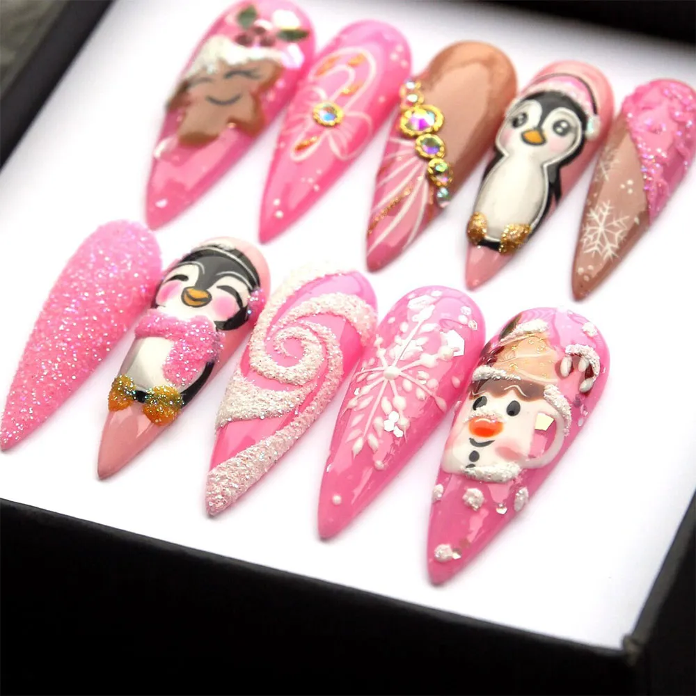 This set is a joyful celebration of Christmas charm and nail artistry at its most whimsical. The vibrant hot pink base runs throughout the set in different finishes — glossy, glitter, and matte — creating a cohesive and energetic holiday palette. Standout design details include: two hand-painted penguin characters, one wearing a pink earmuff hat with gold feet accents standing tall and proud, and one blushing with rosy cheeks wearing a glittery collar necklace, a charming snowman with an orange nose and a cozy snow-dusted hat, a hand-painted sleeping reindeer with closed lash eyes and holly berry accents on its antlers, a peach-toned nail featuring white swirl line art and cascading AB iridescent rhinestone gems in gold settings, white textured 3D snow swirl sculpted on a pink base, a large detailed white snowflake on a pink background, scattered snowfall dot details, a warm caramel-toned nail with hand-painted white snowflakes, and a full-coverage hot pink chunky glitter nail that dazzles from every angle. Each press on nail brings its own personality while the whole set feels cohesive, festive, and full of heart.