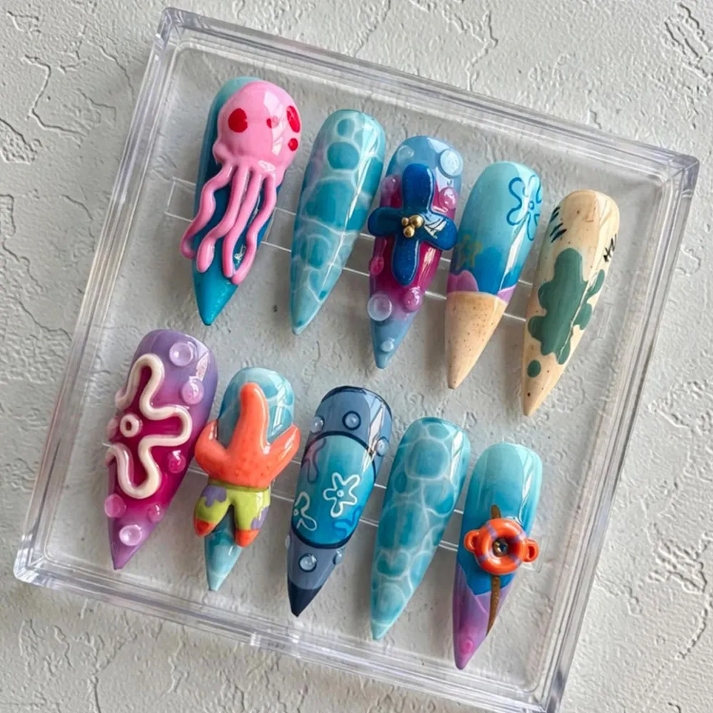 Each nail in this set is a miniature masterpiece bursting with color and personality. The designs feature iconic Spongebob universe characters reimagined as stunning nail art — a bubbly pink 3D octopus/jellyfish, an orange starfish (hello Patrick!), a glittery blue flower charm with gold bead detail, and a cute orange fish with googly eyes. Background nails showcase a dreamy aqua ocean water texture, sandy beach tones with speckles, purple bubble swirls with white squiggly lines, and soft blue underwater scenes with starfish outlines and pearl accents. The mix of glossy finishes and bold 3D sculptural elements makes this press-on set truly one of a kind.