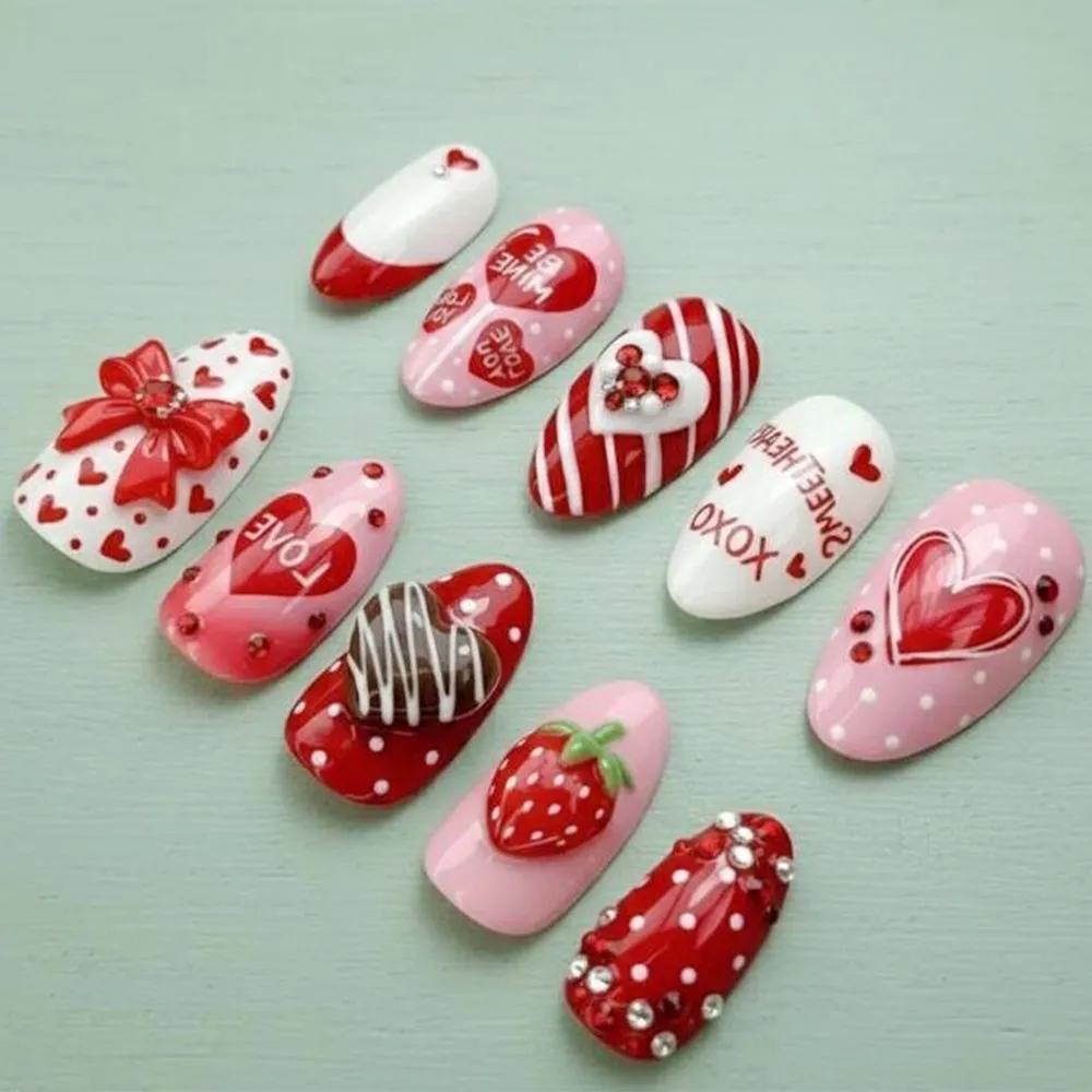 This irresistible ten-piece set showcases a rich variety of Valentine’s designs across a red, pink, and white palette: a blush pink polka dot nail featuring a bold hand-painted red heart with white outline and scattered red crystal gems; a crisp white nail with “Sweetheart XOXO” lettering and mini red heart accents; a bold red and white candy cane stripe nail topped with a 3D fluffy white heart charm crowned with red and silver rhinestone clusters; a pink nail with “Be Mine,” “Love You” conversation heart lettering and layered red heart art; a classic white French tip nail with a glossy red heart gem drop detail; a red polka dot nail with an elaborate mixed crystal rhinestone border in red and clear for a jeweled crown effect; a pink nail with a lifelike 3D strawberry charm complete with green leaves and white dot texture; a red polka dot nail featuring a 3D chocolate-drizzled brownie heart charm; a deep red nail with a bold “Love” script, oversized red heart art, and scattered rhinestone gems; and a white heart-print nail with a glamorous 3D glossy red bow centerpiece and crystal gem accent. Every nail is finished in a mirror-smooth high-gloss coat.