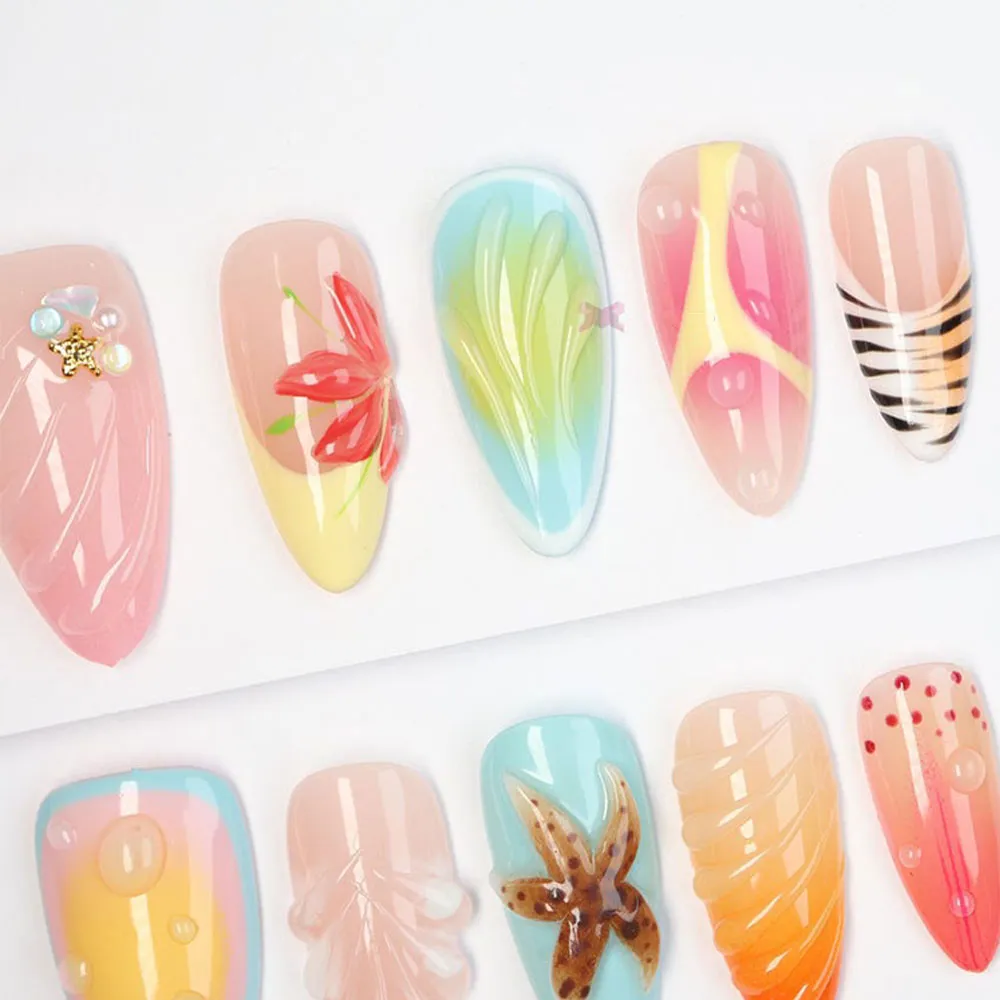 Each set is meticulously hand-painted with vibrant, beach-inspired artwork that bursts with color and personality. Playful 3D details add a tactile, eye-catching dimension that sets these press-ons apart from anything you’ve seen before. The Y2K-inspired design brings together retro surf culture, tropical motifs, and that iconic early-2000s energy — think bright hues, glossy finishes, and fearless self-expression all in one stunning set of fake nails.