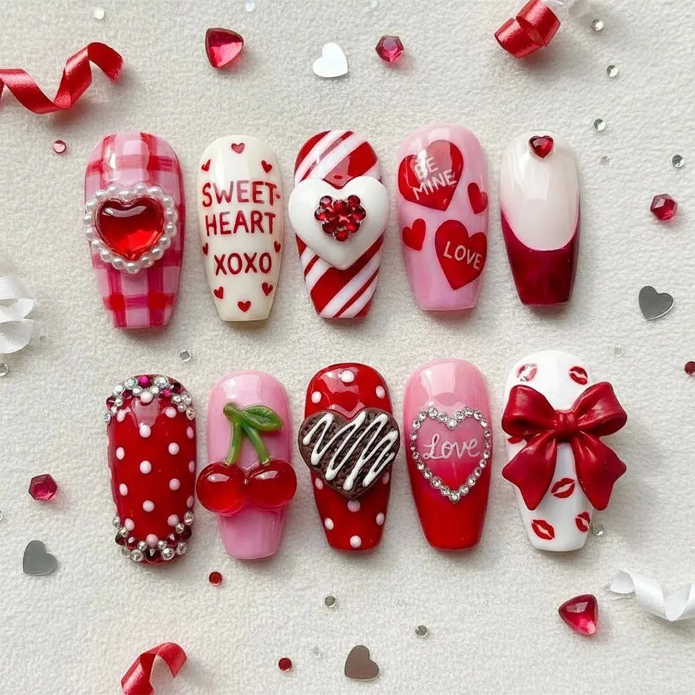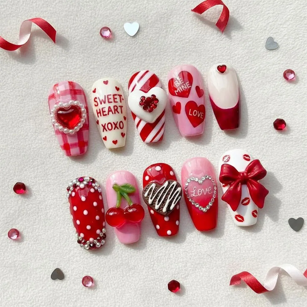 This extraordinary ten-piece set features a dazzling collection of individually crafted designs: a pink plaid tartan nail with a stunning 3D pearl-framed red gem heart centerpiece; a creamy white nail with “Sweetheart XOXO” lettering and scattered mini red hearts; a candy cane stripe nail in bold red and white topped with a 3D white chocolate heart adorned with red crystal gems; a blush pink nail with “Be Mine” and “Love” conversation heart lettering surrounded by glossy red hearts; a soft pink French tip nail with a dangling red crystal rhinestone accent; a red polka dot nail with a sparkling crystal-encrusted border crown detail; a pink nail featuring a bold 3D glossy cherry charm with green stem; a red polka dot nail showcasing a 3D chocolate brownie drizzle charm; a red and pink polka dot nail with a rhinestone heart outline and “Love” script lettering; and a white nail with red lip kiss print art and a glamorous 3D red satin bow centerpiece. Every nail is finished in high-gloss and packed with dimensional charm details that make this set truly one of a kind.