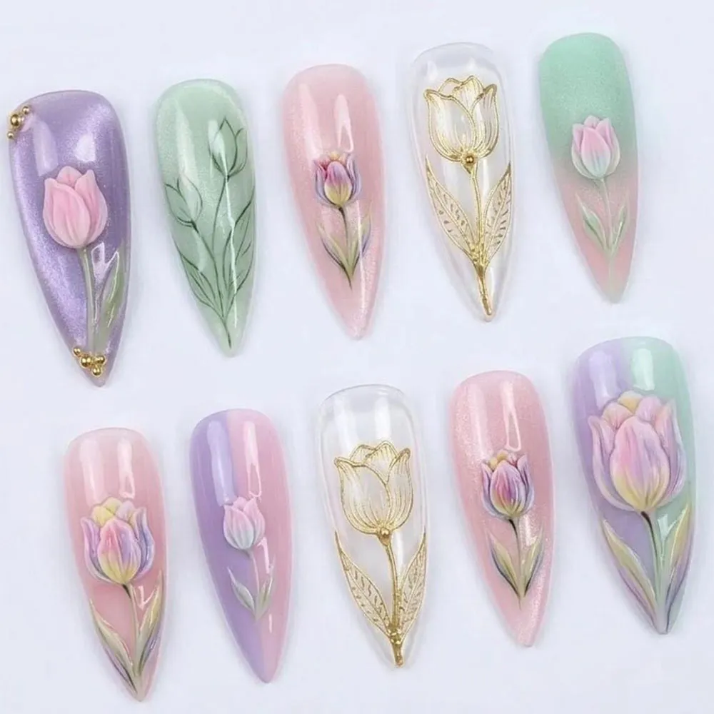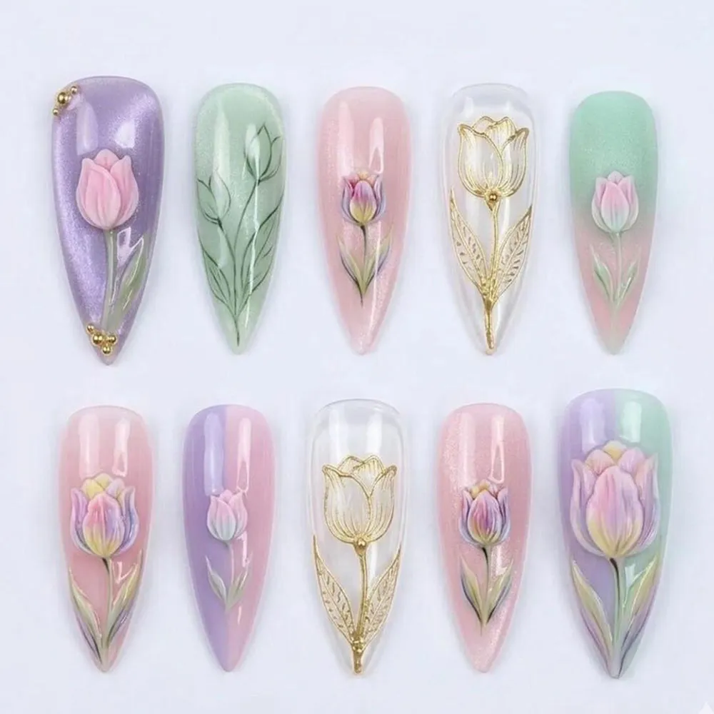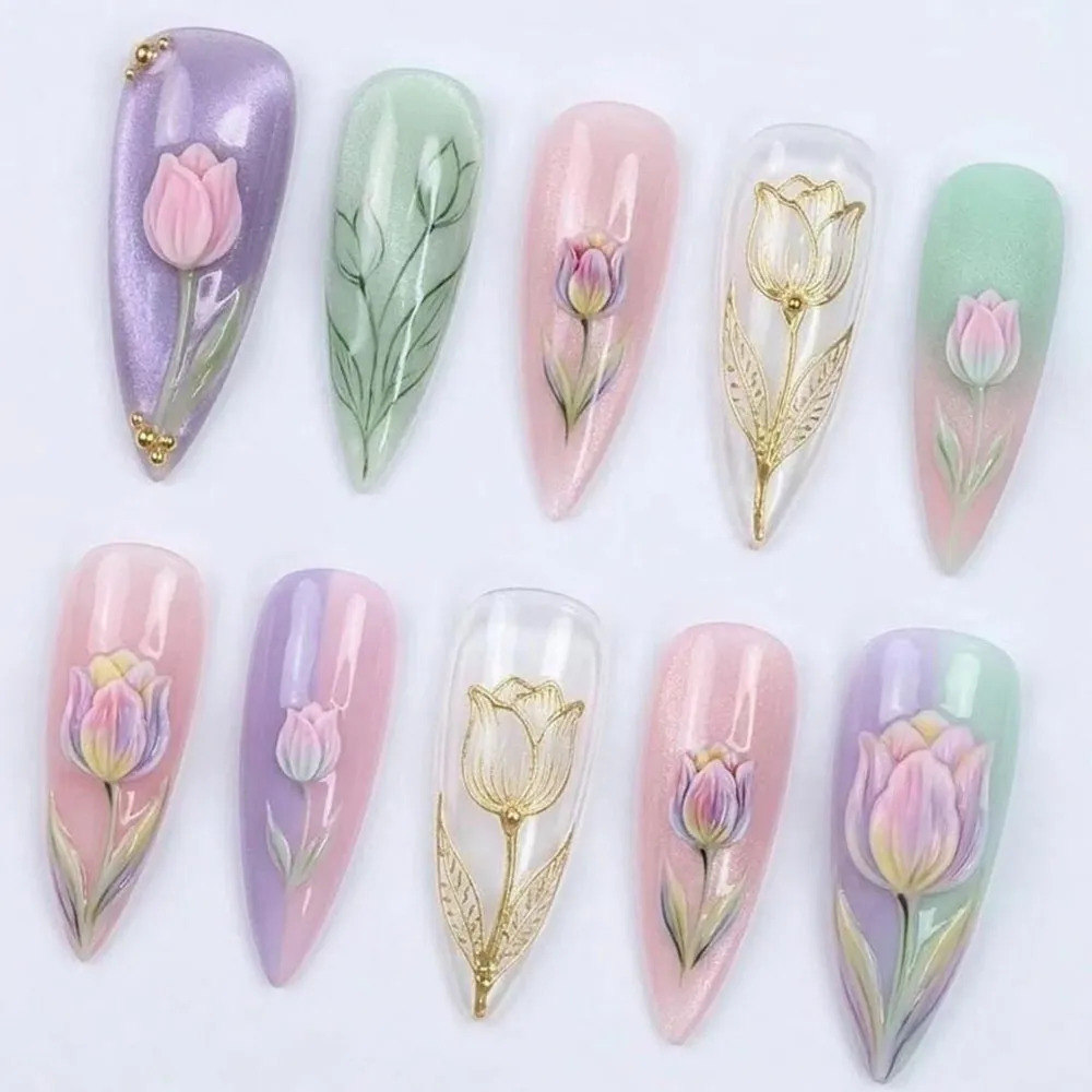 This press on nails set is a breathtaking celebration of the tulip in every possible form — sculpted, painted, engraved, and gilded — across a dreamy palette of lilac purple, blush pink, mint green, and pearlescent white that shifts and glows with an aurora shimmer running beneath every base. No two nails are identical, yet every single one belongs together in perfect harmony. The statement purple nail opens the collection with a bold aurora shimmer base in rich violet, from which a 3D sculpted tulip bloom rises with fully dimensional petals in soft pink and gold bead stud accents — a jewel-like centerpiece that sets the luxurious tone for the entire set. The sage green nail features a hand-painted tulip in fine botanical illustration style — a single graceful stem with elongated leaves rendered in soft green brushstrokes that feel like a page from a vintage flower encyclopedia. A blush pink shimmer nail carries a dimensional tulip bud in soft relief, partially open and perfectly formed, painted with delicate gradient tones from pink to lavender. The sheer glass nail is perhaps the most extraordinary — a golden tulip outlined entirely in raised gold metallic linework, its petals and leaves rendered like an illuminated manuscript illustration, glowing against the transparent base like stained glass in a cathedral. The mint green nail rounds out the upper row with a sculpted 3D tulip in blush and cream tones, grounded and elegant. The lower row amplifies every detail — a large multicolor tulip bloom in pink, lavender, and yellow brushwork on a pink-to-purple ombre base, another gold-outlined glass tulip on sheer white, and a deeply dimensional tulip in full sculptural bloom on a lavender-to-pink shimmer base make these fake nails an unmatched collection of botanical artistry.