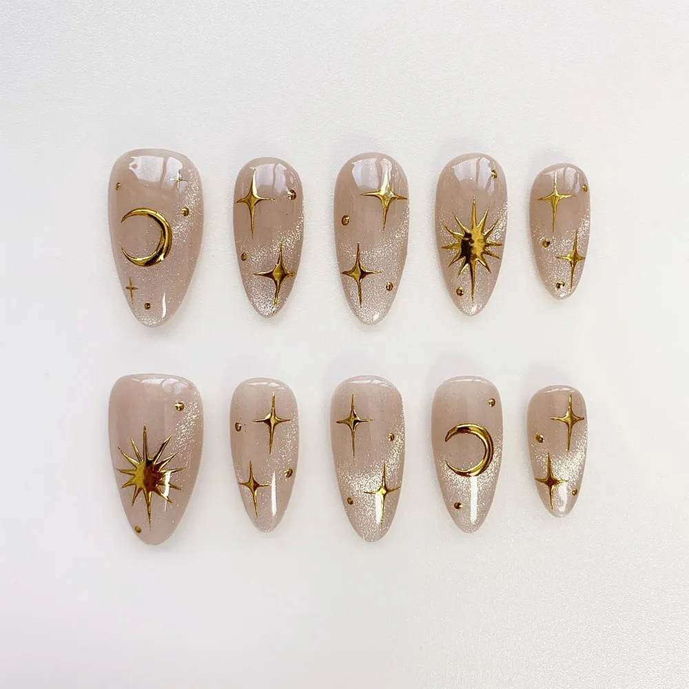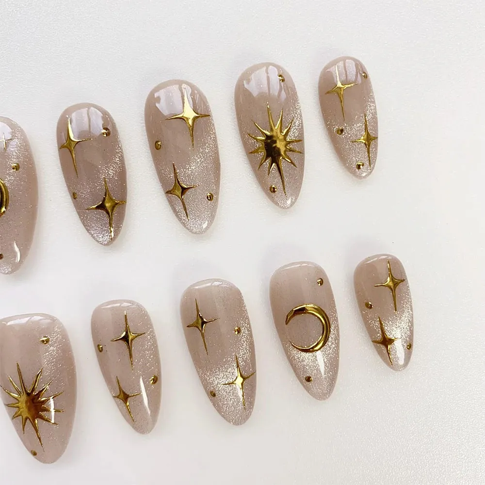 Each set features a deep, brooding black base infused with a mesmerizing aura cat eye effect that shifts and pulses with a supernatural, gemstone- like glow from every angle. Moon and sun motifs radiate across the nail surface with celestial authority, while shimmering star accents scatter like constellations across a midnight sky. The gyaru-inspired maximalist quality of the design pushes the gothic aesthetic into bold, fashion- forward territory — dark, dramatic, and undeniably captivating. These fake nails deliver a flawless, salon-quality gel finish that makes every aura shimmer and celestial detail burn with a haunting, otherworldly brilliance.