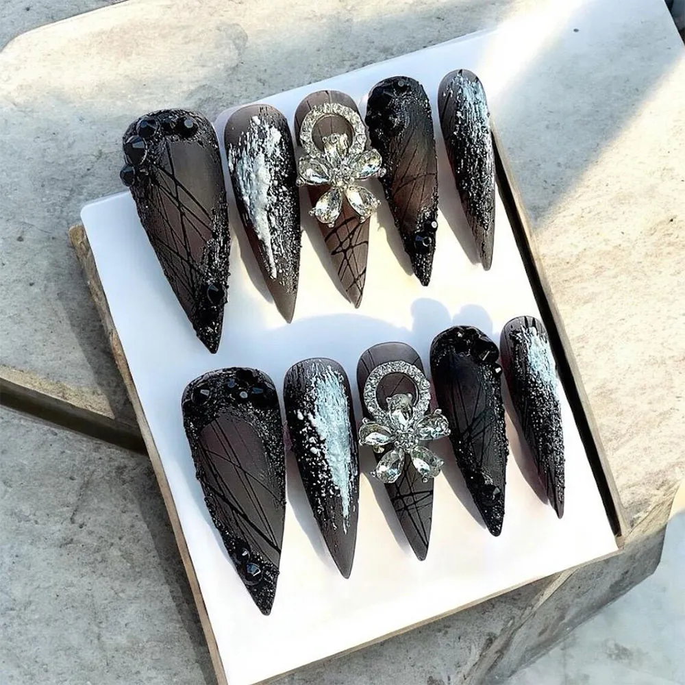 The set is built on a rich deep black matte base with a subtle smoky brown undertone that adds mysterious depth. Delicate hand-drawn spider web line art in matte black weaves across each nail, creating an intricate gothic texture that feels effortlessly editorial. Silver foil flakes and shimmering powder are swept across select nails for a crushed-ice effect that contrasts beautifully against the dark matte finish. The crown jewel of this set is the oversized 3D crystal flower charm — featuring teardrop and marquise-cut clear rhinestones set in a halo ring, sitting boldly atop the nail like a piece of fine jewelry. Scattered black onyx gems add an extra layer of dark glamour throughout the set.
