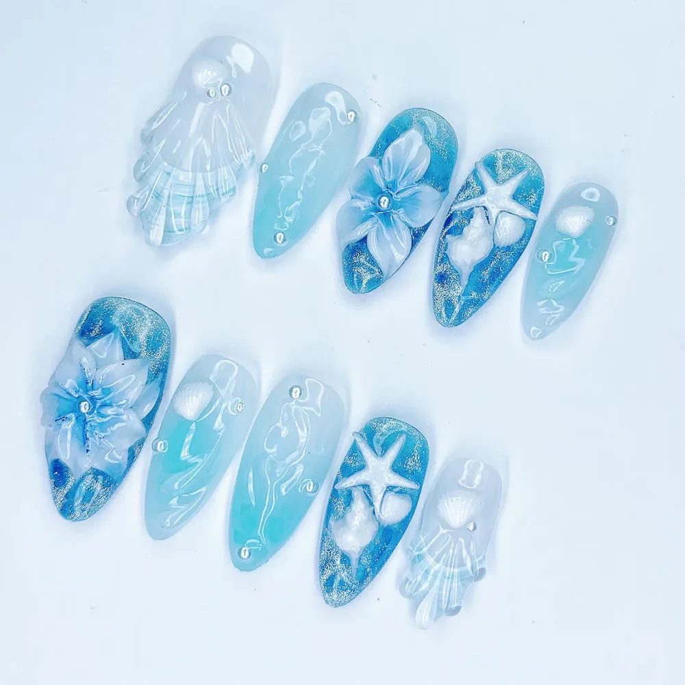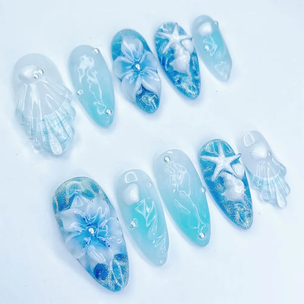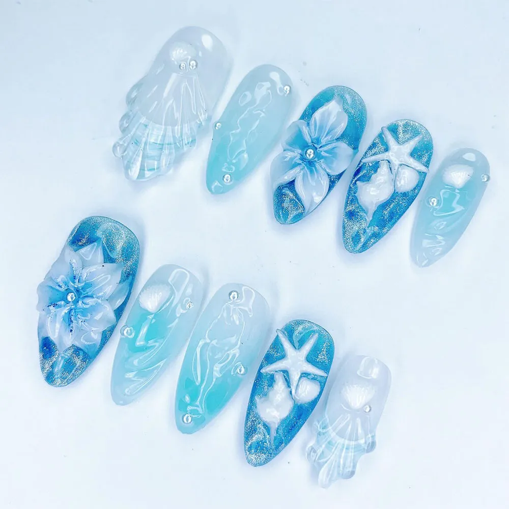 These summer nails are a stunning choice for beach vacations, coastal weddings, resort wear, mermaid-themed events, and any occasion where you want nails that feel serene, luxurious, and one-of-a-kind. They pair effortlessly with white, sky blue, navy, or aqua outfits and feel equally at home on a yacht or a sandy shore. These press on nails also make a dream gift for ocean lovers, beach brides, and anyone who finds peace by the water.