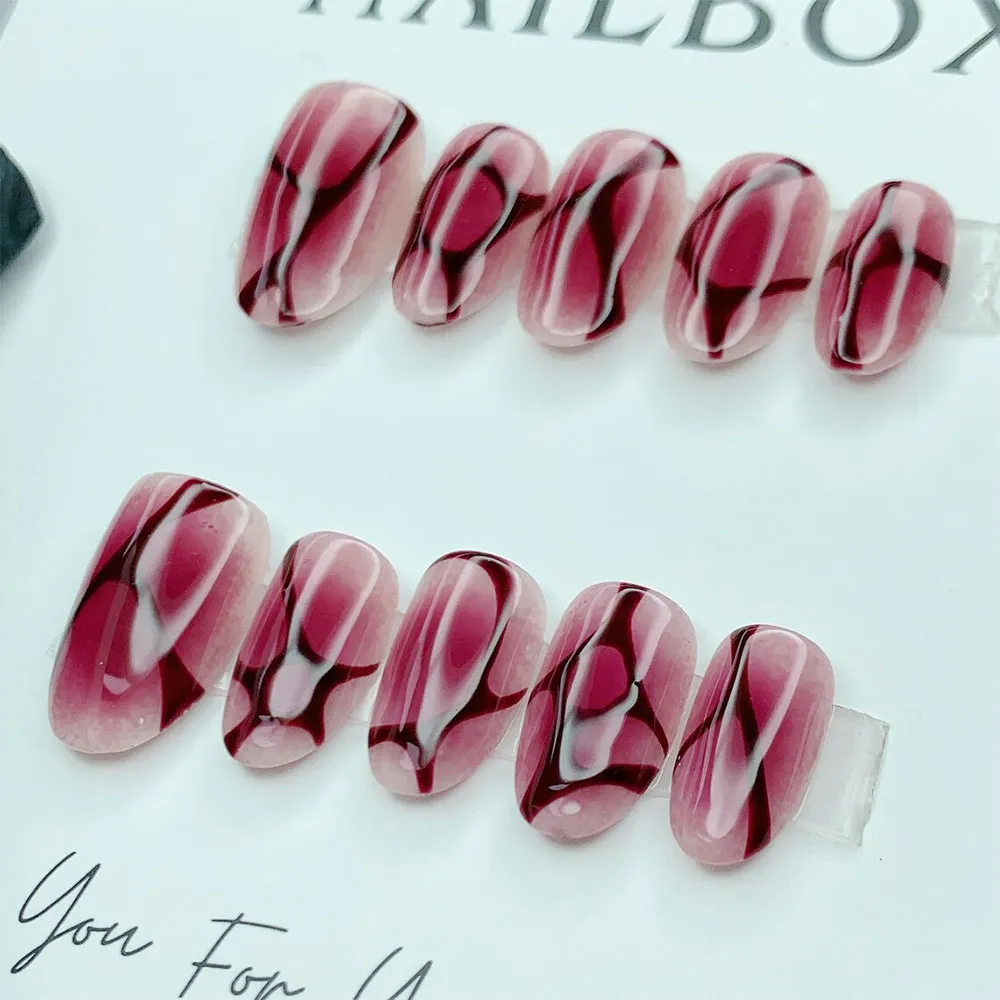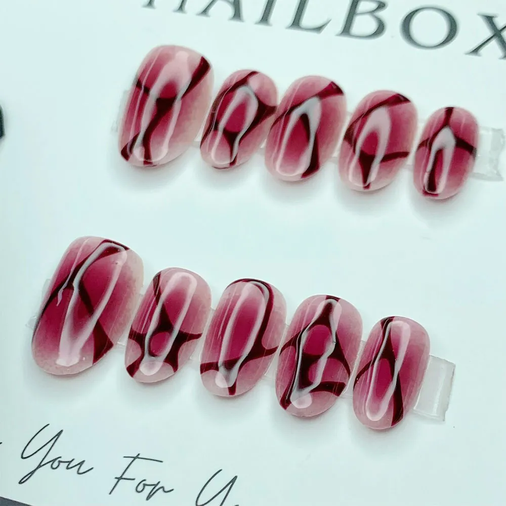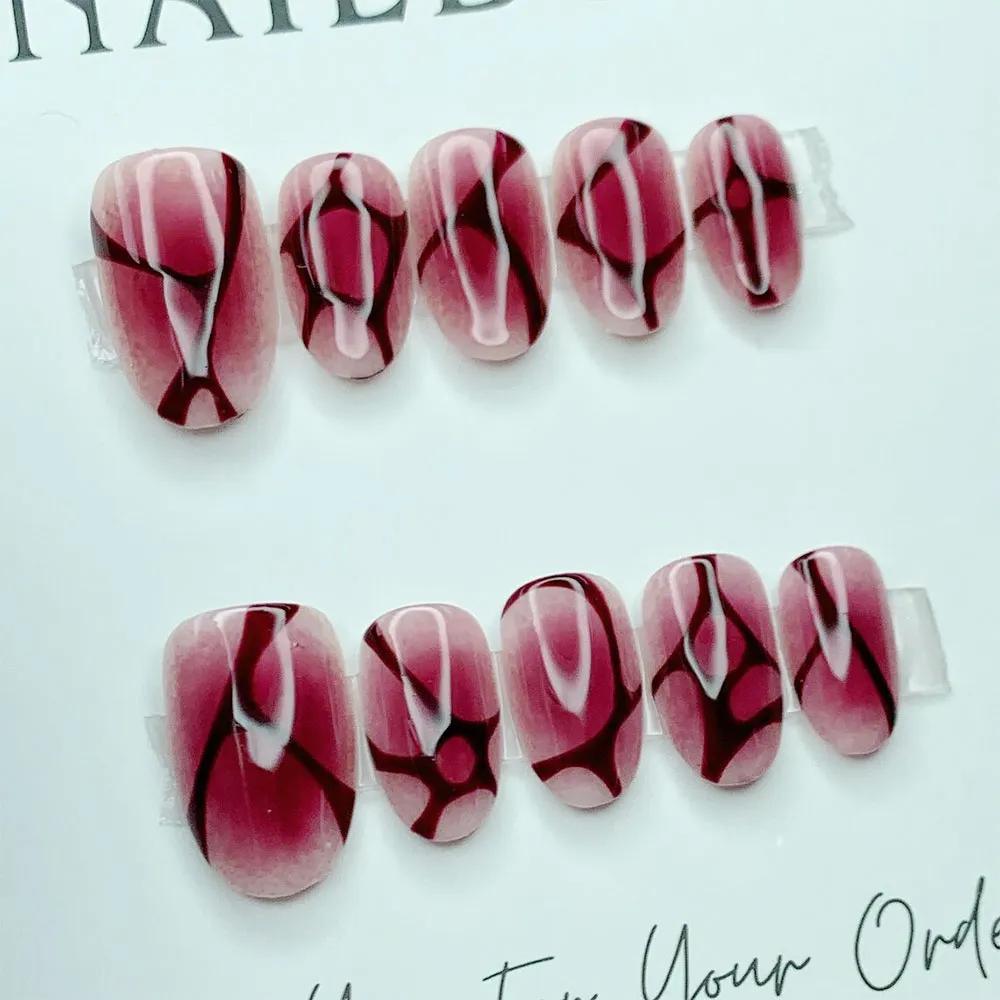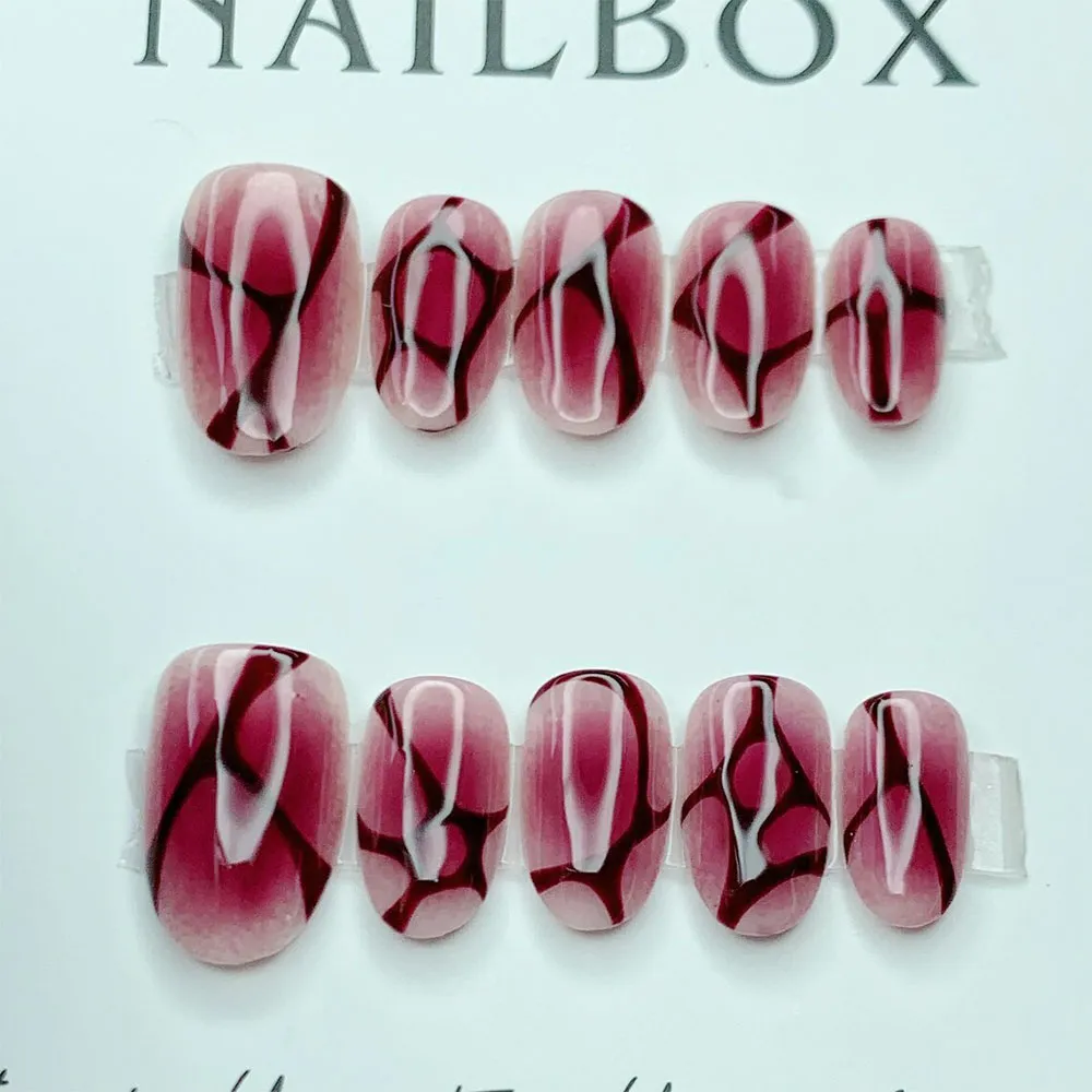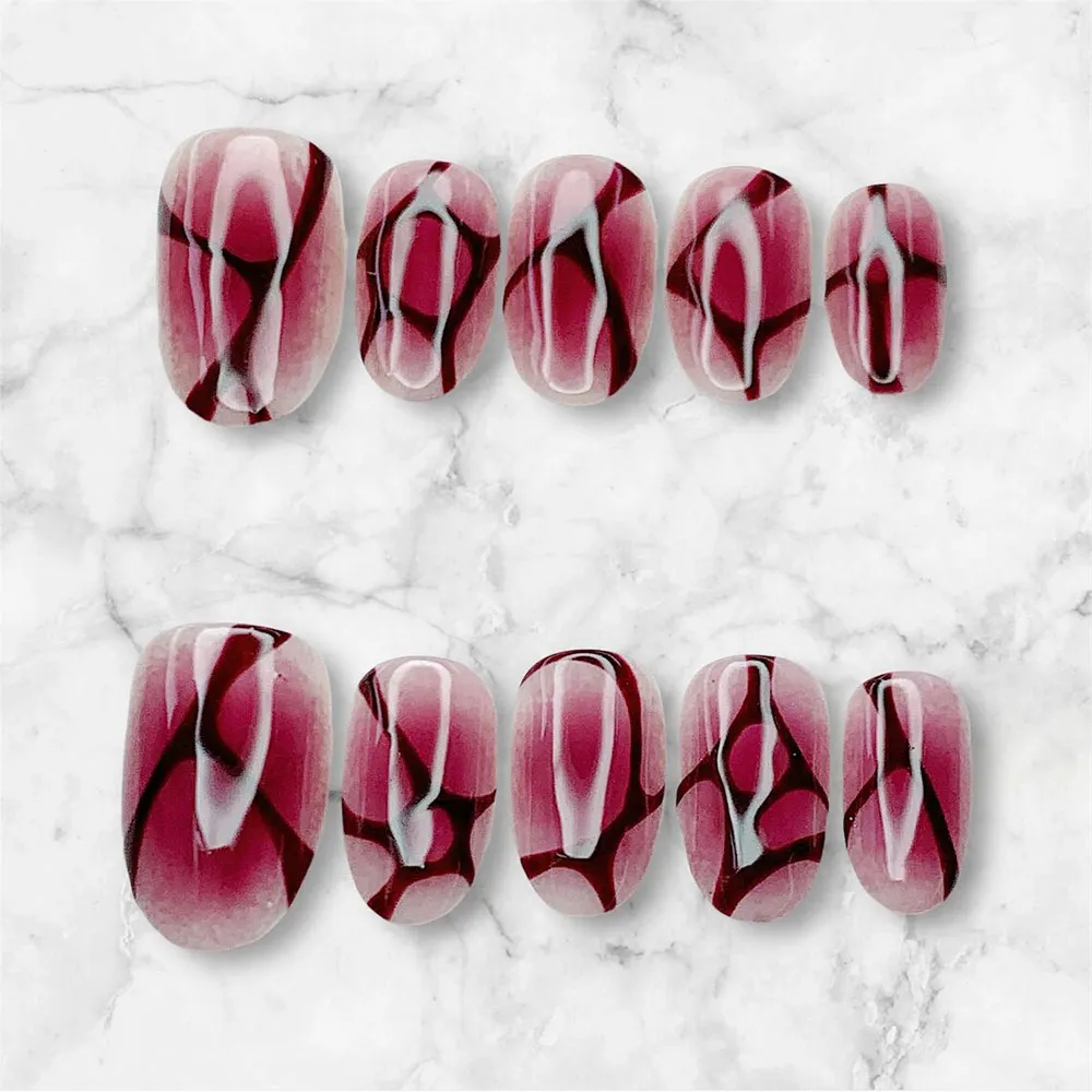 Each press on nail features a mesmerizing abstract marble design built on a deep burgundy and dusty rose base. Flowing white veins sweep organically across the nails in bold, expressive strokes, creating a dramatic cracked-glass or shattered stone effect. Deep wine and near-black shadow tones add depth and dimension between the veins, giving the overall design a three-dimensional, sculptural quality. The finish is glossy and glass-like, amplifying the richness of the burgundy tones and making the white vein art pop with maximum contrast. Every nail in the set carries a slightly unique vein pattern, so the full look feels artisanal, organic, and truly one of a kind — like wearing a piece of dark marble jewelry on each finger.