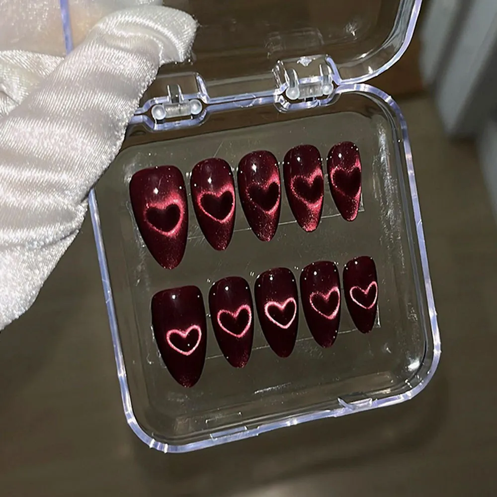 Each nail in this stunning set is coated in a rich burgundy-red cat eye gel finish — a magnetic effect that creates a mesmerizing, three-dimensional light shift across the nail surface, reminiscent of a cat’s eye catching the light. The true showpiece of this set is the glowing heart detail, created through the cat eye magnetic technique itself: a soft, luminous pink-white heart shape appears to radiate from within the dark base, as if lit from the inside. The effect is hauntingly beautiful and deeply romantic — bold yet refined, edgy yet feminine. Nails arrive neatly packaged in a clear acrylic nail box, making this set a stunning gift-ready option straight out of the box.