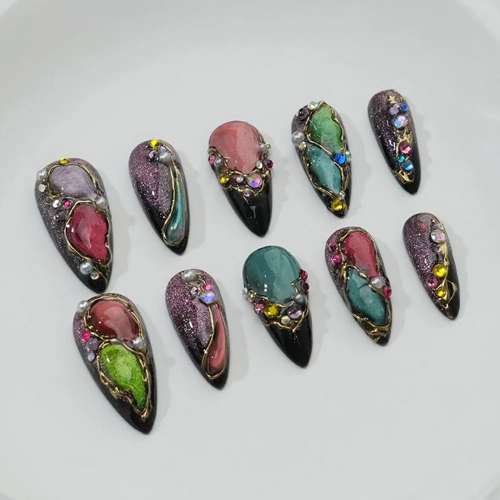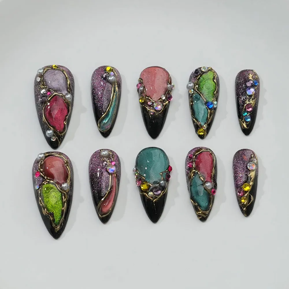 Each set is lovingly handmade with a rich brown cat eye base that shifts and glows with a mesmerizing, gemstone-like depth that moves beautifully with every gesture. Hand-sculpted 3D gold chrome accents are placed with deliberate artistry across the nail surface, catching the light with a mirror-like brilliance that makes these fake nails impossible to look away from. Star motifs and sparkle details weave through the design like constellations, adding a celestial, party-ready energy that makes this set as perfect for a wedding as it is for a glamorous night out.