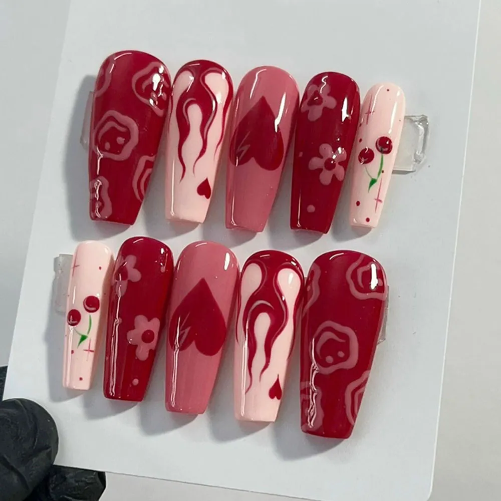 This showstopping set features five distinct hand-painted designs across glossy long nails: flame swirl patterns in pink-on-red for a hot, Y2K aesthetic; oversized heart motifs on a dusty pink base with red drip-style accents; cute cherry nail art with green stems and sparkle star details on a blush background; playful daisy florals scattered across deep red; and abstract blob/grunge art in a contrasting red-on-red tone for an edgy, underground feel. Every design is finished in a high-gloss lacquer that makes the colors pop with intense, vibrant depth. The combination of cherry, flame, heart, and flower details in one cohesive set gives off irresistible Y2K nostalgia meets modern dark feminine energy.