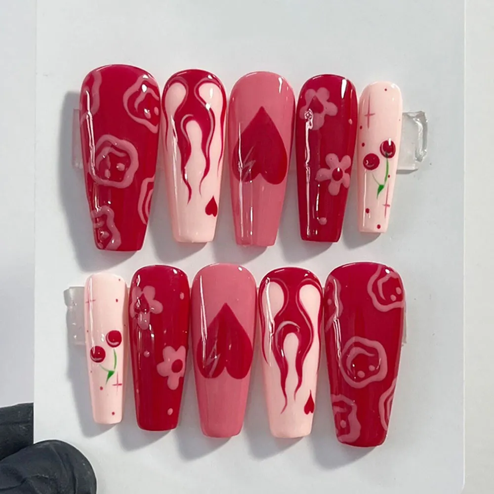 These press on nails were made for Valentine’s Day celebrations, concert outfits, date nights, or any moment when you want your nails to be the main character. The bold red and blush pink palette pairs perfectly with leather jackets, corset tops, mini skirts, or anything that matches your fierce, romantic mood. Whether you’re a cherry girl, a flame lover, or a heart girlie — this set has something for every vibe.