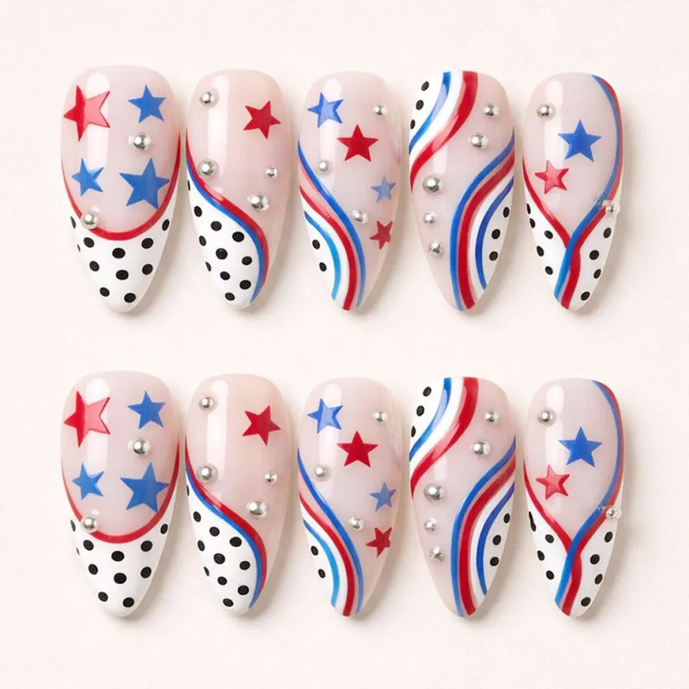 Every nail in this set is a perfectly balanced mix of fun and feminine patriotic design. The warm blush pink base gives the entire set a soft, dreamy foundation that sets it apart from traditional bold red-white-blue manicures — making it feel modern, wearable, and effortlessly chic. The lower half of each nail transitions into a crisp white section covered in black polka dots, creating a playful retro contrast that adds personality and dimension to the design. Flowing red, white, and blue wavy stripe lines sweep gracefully across the blush surface, mimicking the movement of ribbon or a waving flag in a soft, artistic way. Scattered throughout are red and blue five-point stars in varying opacities — some bold and vivid, others softer and translucent — for a whimsical, layered star effect. Small silver rhinestone cabochon accents are dotted across each nail, catching the light and adding a touch of subtle glam to the playful overall aesthetic. The combination of matte-effect stars, glossy stripes, polka dot sections, and rhinestone sparkle gives these fake nails a multi-textured, high-fashion finish that feels truly unique.
