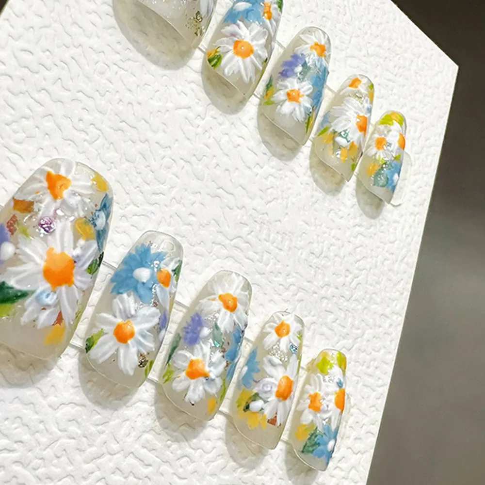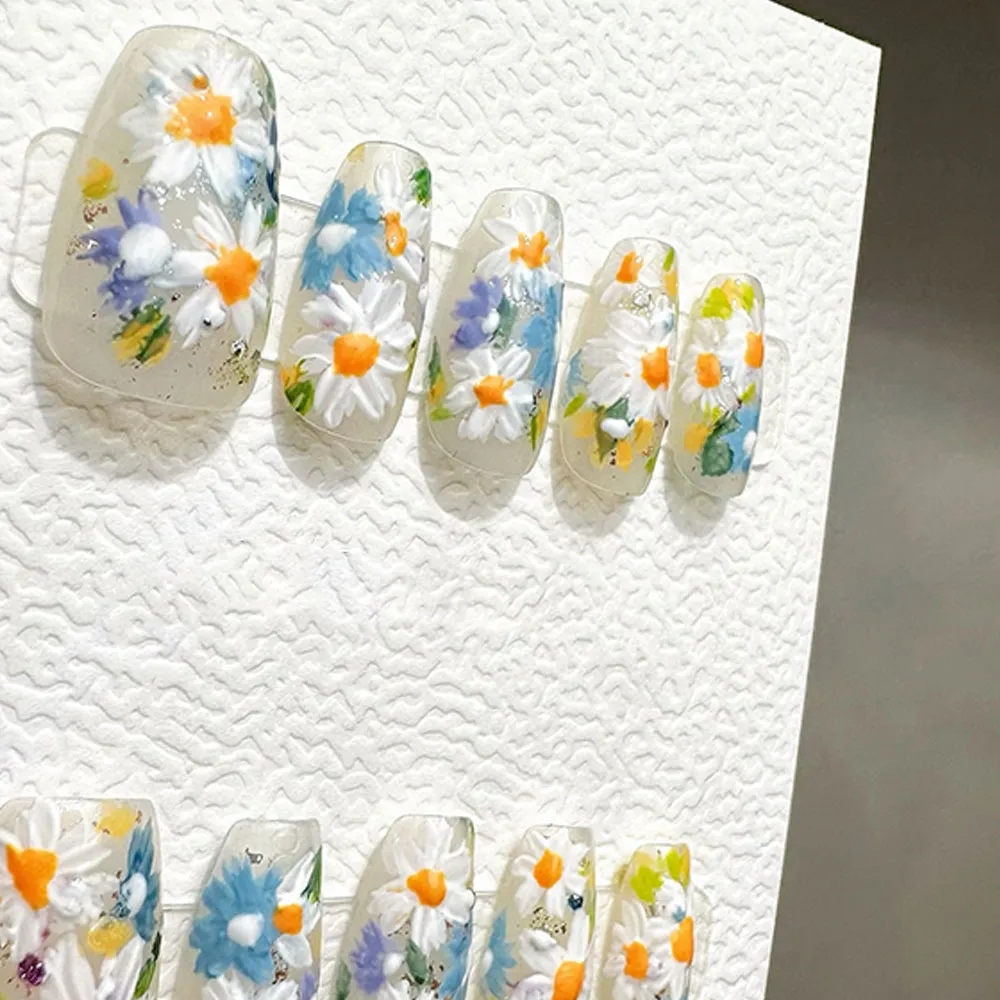 Each set is lovingly handmade with premium gel formula, delivering a flawless, high-gloss finish that makes the playful daisy motifs pop with freshness and vitality. Sweet daisy details are crafted with careful precision, radiating that effortless cottagecore charm that never goes out of style. Best of all, these fake nails are fully reusable — a sustainable, salon-quality beauty choice you can reach for again and again, season after season.