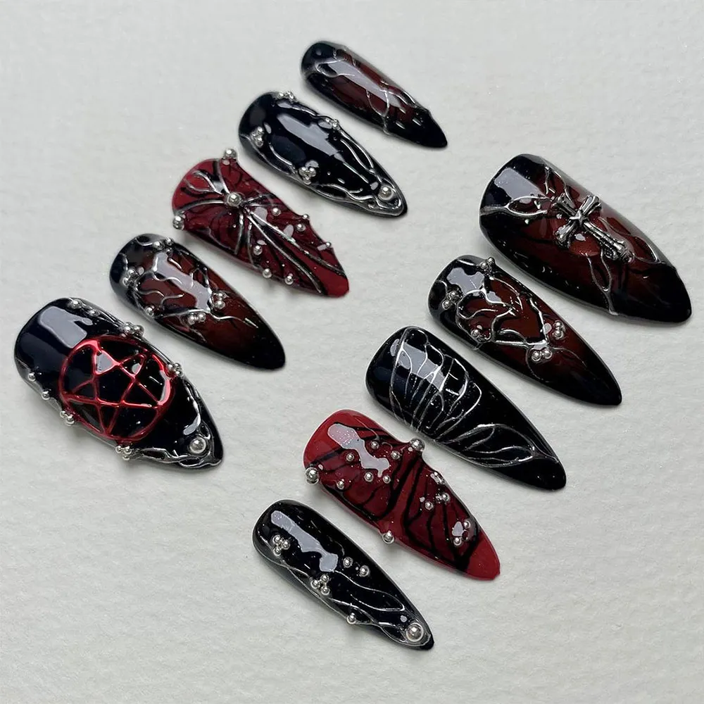 These press-on nails are the ultimate choice for Halloween parties, rock concerts, gothic events, night outs, costume parties, or any occasion that calls for a look that is dark, dramatic, and utterly unforgettable. Style them with an all-black ensemble, a deep crimson gown, leather co-ords, or your most gothic-inspired outfit — these press-ons bring a powerful rush of dark feminine energy to every look.