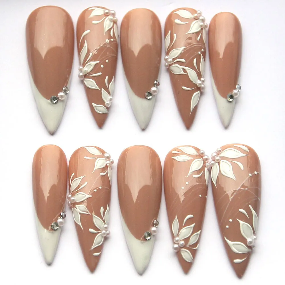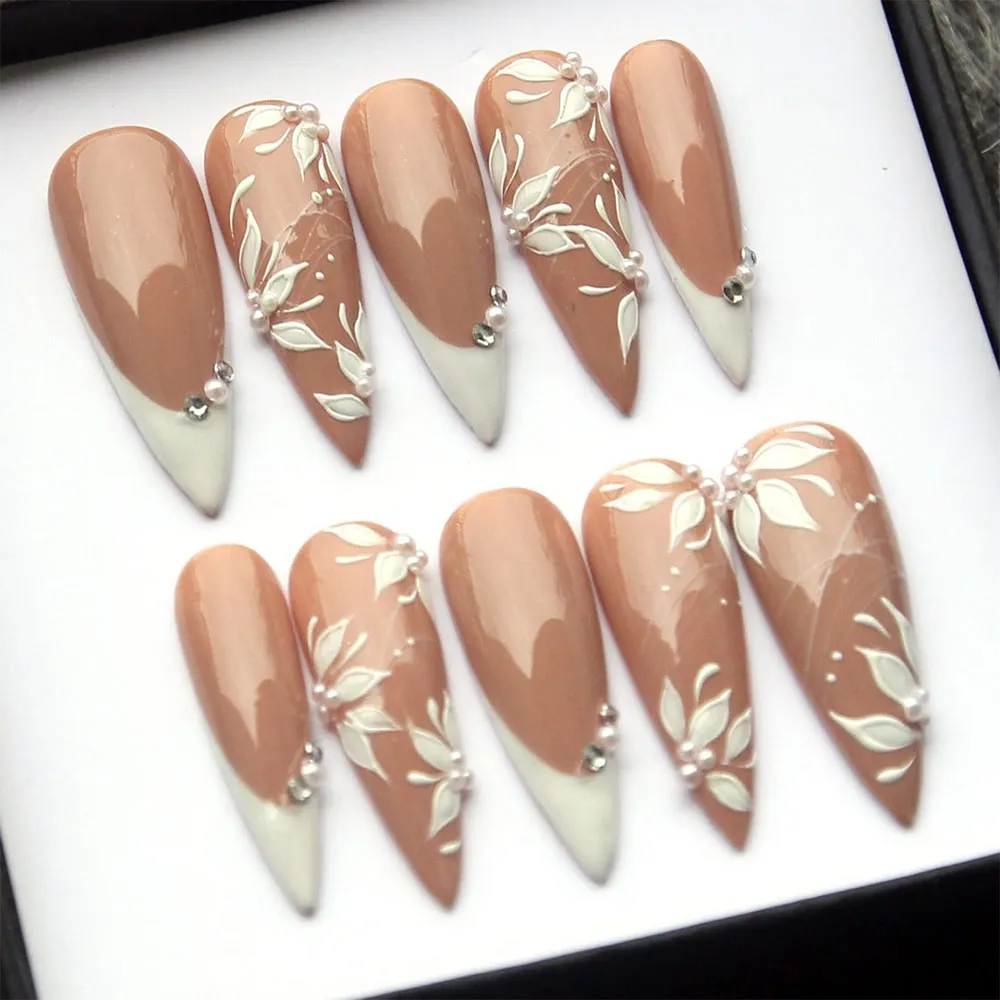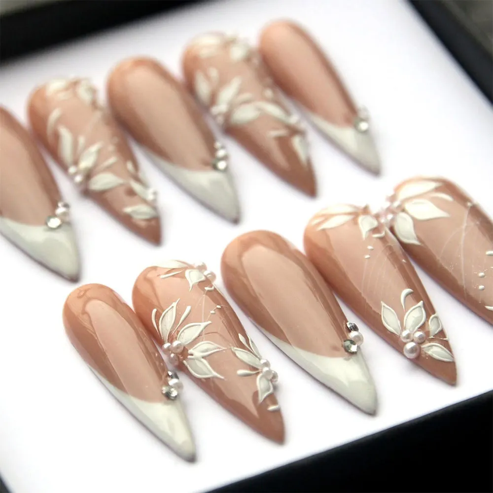 Each set features a classic white French tip elevated with intricate floral detailing that blooms softly across the nail surface. Refined and timeless, the design strikes the perfect balance between traditional bridal elegance and modern nail artistry. Delicate petal patterns, fine botanical lines, and a flawless high-gloss gel finish come together to create these fake nails that feel as luxurious as they look — salon-quality beauty you can wear again and again.
