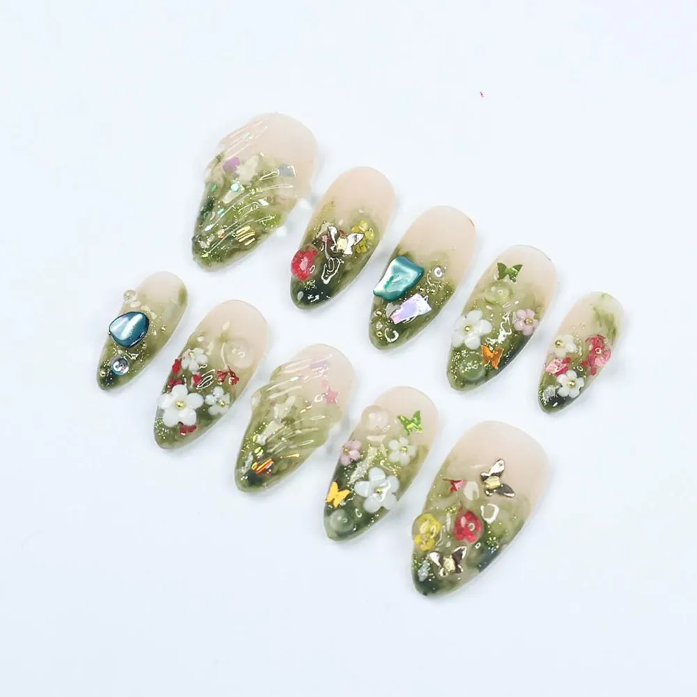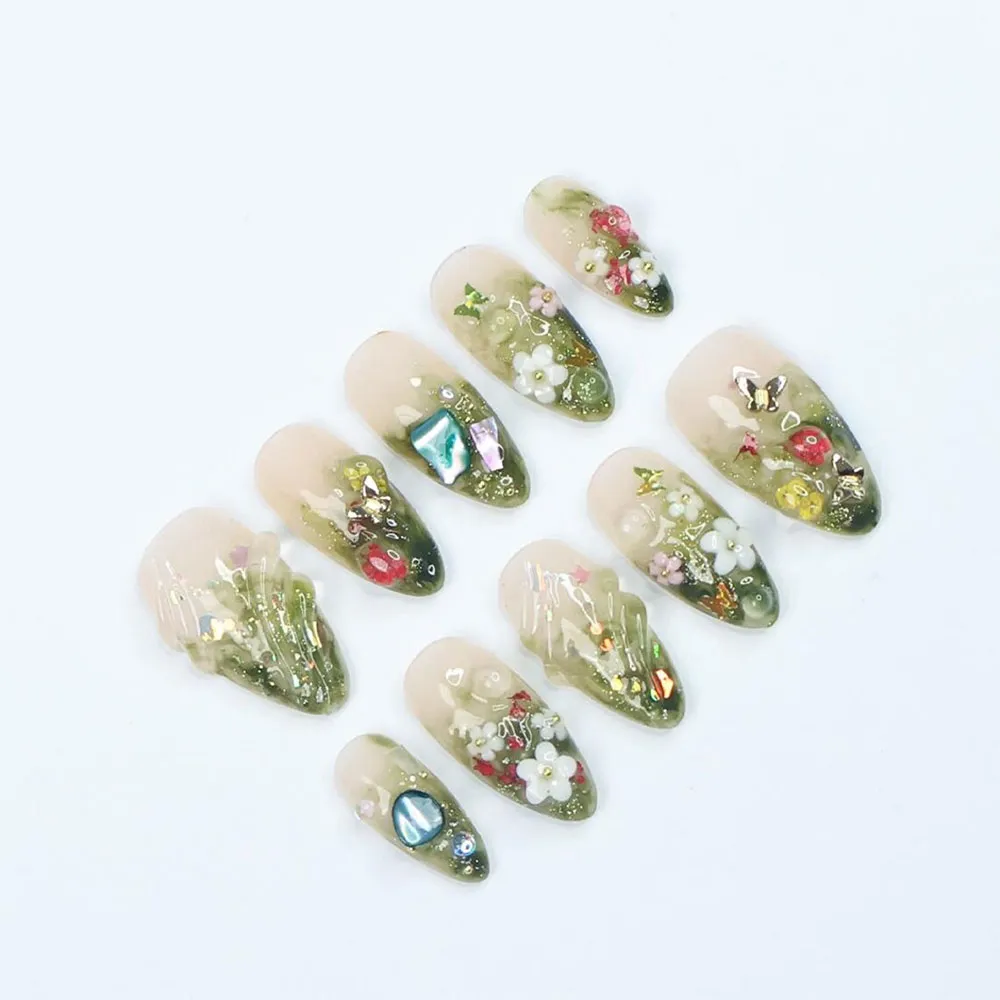 Each set is lovingly handmade with a deep green ombre base that flows from soft sage to rich forest green, evoking the serene beauty of sunlight filtering through ancient trees. Hand-sculpted 3D floral accents bloom across the nail surface with delicate precision, while sparkling gem embellishments catch the light like morning dew on petals. Every detail of these fake nails is crafted with meticulous care, resulting in a set that feels like wearable botanical art — utterly one of a kind and impossible to replicate.