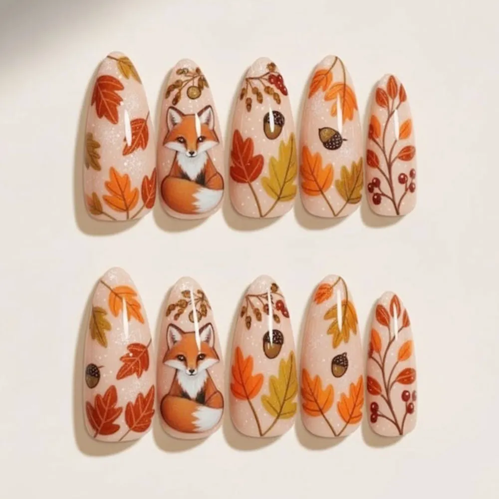 The entire set flows together as one seamless autumn scene, with motifs scattered across each nail like illustrations from a cosy nature journal. A fluffy orange fox with bright eyes and a white chest sits contentedly among the falling leaves — painted with remarkable warmth and charm as the undisputed star of the set. Surrounding the fox on every nail is a cascade of maple leaves in vivid orange, rust red, deep burgundy, and golden yellow, all painted with delicate detail against the soft blush-nude base. Plump brown acorns with textured caps dot the nails alongside graceful botanical berry branches — thin winding stems adorned with clusters of deep red berries and small autumn leaves in warm amber. A soft shimmer runs across the nude base of these press on nails, giving the whole set a gentle, glowing luminosity that feels fresh and ethereal rather than heavy. The glossy topcoat sharpens every illustrated detail beautifully.