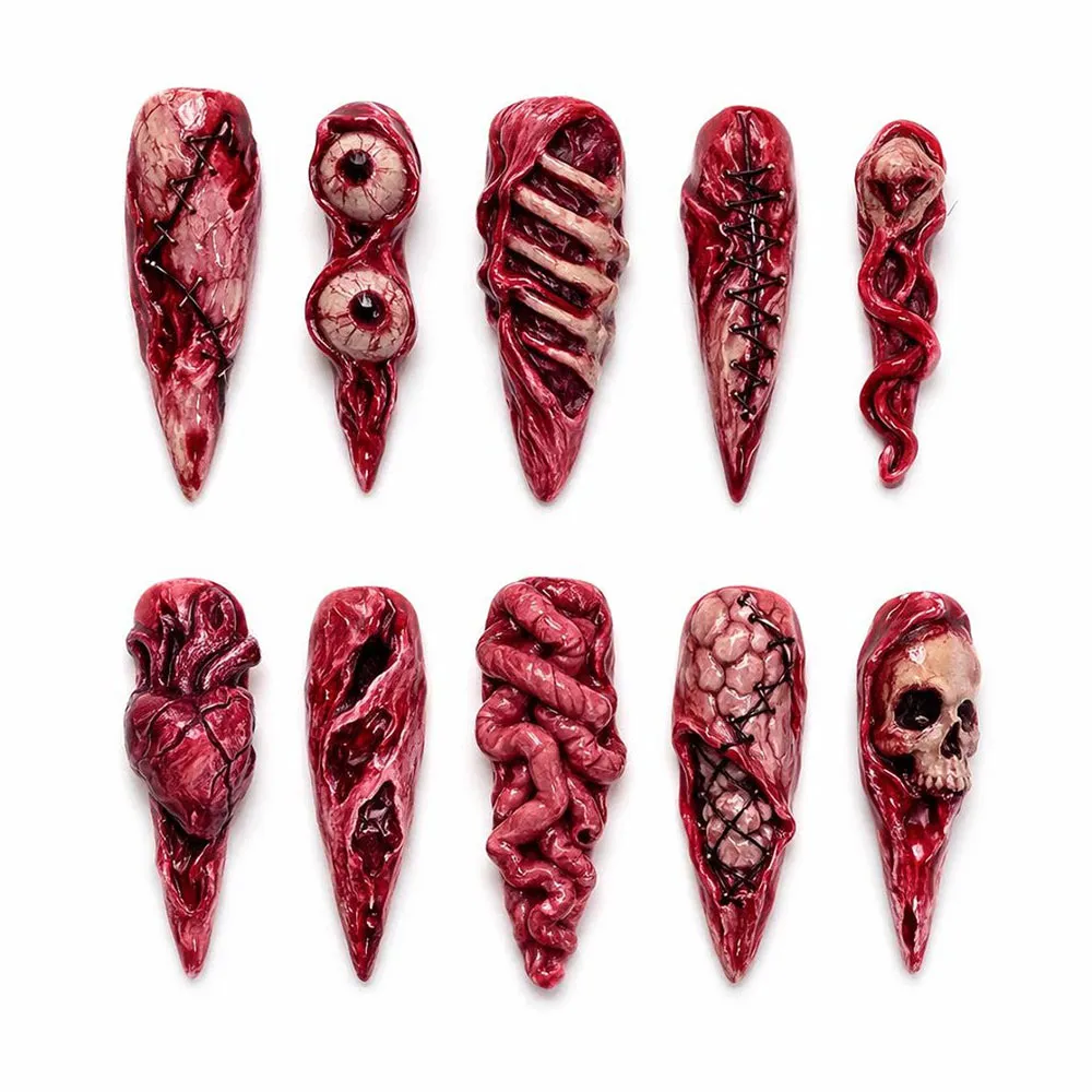 Every single nail in this set is a fully dimensional, hyper-realistic 3D sculpture crafted to shock and awe. Deep crimson and raw flesh tones dominate the palette, creating a viscerally realistic horror aesthetic from tip to base. Each nail features its own grotesque masterpiece — a bleeding eyeball with red-veined detail and a black gemstone pupil bulges dramatically from one nail, while exposed rib cage bones claw through torn flesh on another. Black surgical stitches lace across raw wound textures, sealing gaping cuts with dark thread detail that makes the skin crawl. A coiled serpent-like worm writhes across one nail in sickening realism. A full anatomical human heart — detailed with veins and deep red muscle tissue — occupies another nail in extraordinary sculptural form. Coiled intestines spill from a torn flesh wound on a center nail, rendered with unsettling textural accuracy. Brain matter stitched behind flesh-colored netting adds another layer of horror. And a pale human skull erupts from a blood-soaked base to deliver the final, unforgettable scare. The level of 3D sculpting detail across every nail is absolutely unmatched — these Halloween fake nails are wearable horror art at its absolute peak.
