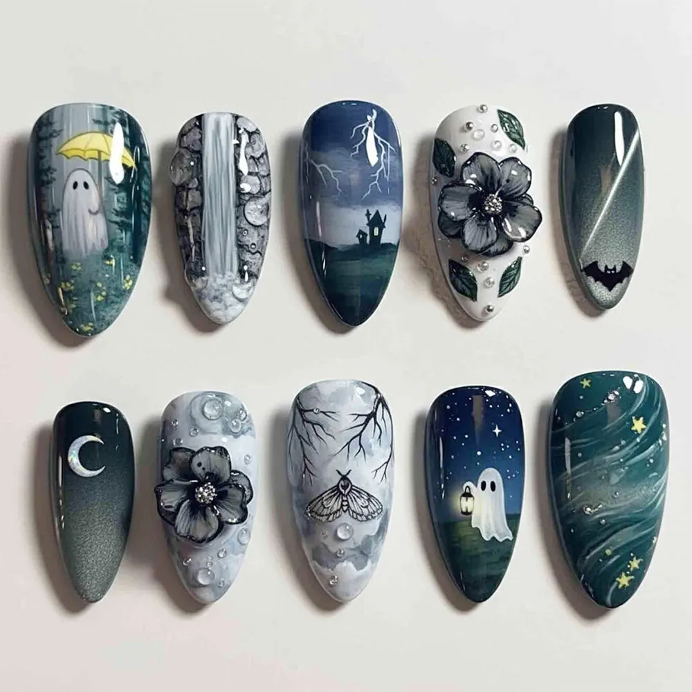 Each nail in this extraordinary set is a hand-painted masterpiece bursting with atmospheric detail. A ghostly figure holding a yellow umbrella wanders through a misty teal forest alive with golden wildflowers — whimsical, melancholic, and utterly magical. A cascading waterfall tumbles over ancient stone in cool grey and silver tones. A stormy night scene captures lightning striking above a silhouetted haunted mansion against a deep blue-grey sky, dramatic and cinematic. A lantern-carrying ghost floats across a star-studded midnight blue meadow, glowing warmly against the dark — hauntingly poetic. Raised 3D dark floral blooms with sparkling crystal centers rest on misty grey bases scattered with dewdrop rhinestones, while detailed moth and bare branch artwork add a dark botanical elegance. A crescent moon gleams on a deep teal shimmer nail, and a lone bat silhouette perches on another. Swirling teal and gold star details on the final nail evoke a Van Gogh-inspired night sky. The colour palette of deep teal, stormy blue, misty grey, and forest green gives the entire set a cohesive, atmospheric depth that is unmatched in artistry.