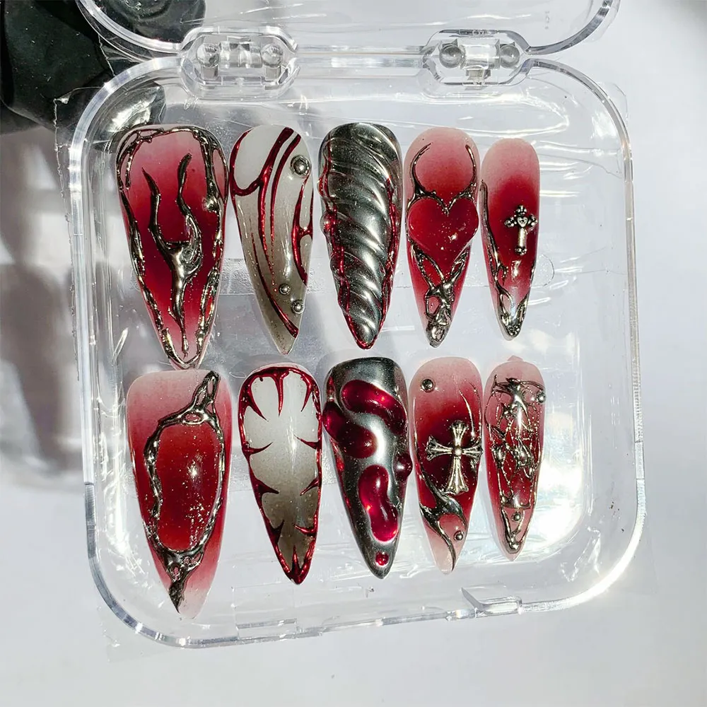 Dangerously beautiful and darkly divine — these Gothic Red Cross press on nails are a bold declaration of dark feminine power. Dripping in blood red, gunmetal silver, and deep black, these fake nails are an unapologetic maximalist masterpiece built for those who wear their darkness like a crown. This is gothic couture for your fingertips.