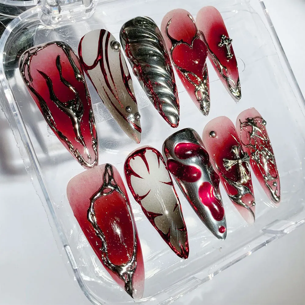 The set is an electrifying mix of textures and motifs across every nail. A deep crimson and blush ombre base sets the mood — moody, rich, and utterly vampiric. Raised 3D silver thorn and branch wire art crawls organically across multiple nails, framing a dramatic oval mirror accent and a bold red glitter heart motif surrounded by silver antler-like structures. Liquid chrome in gunmetal and black creates a breathtaking molten metal swirl effect on accent nails, with glossy blood-red droplets that look like liquid rubies pooling on polished steel. White and red vein-like drip art adds a visceral, horror-editorial quality to the set. The crown jewels are the 3D silver cross charms — one delicate cross with gemstone center, another bold ornate cross with intricate detailing — both sitting atop the red ombre base like sacred dark relics. A silver figure silhouette and spider web charm complete the collection with a final haunting flourish.
