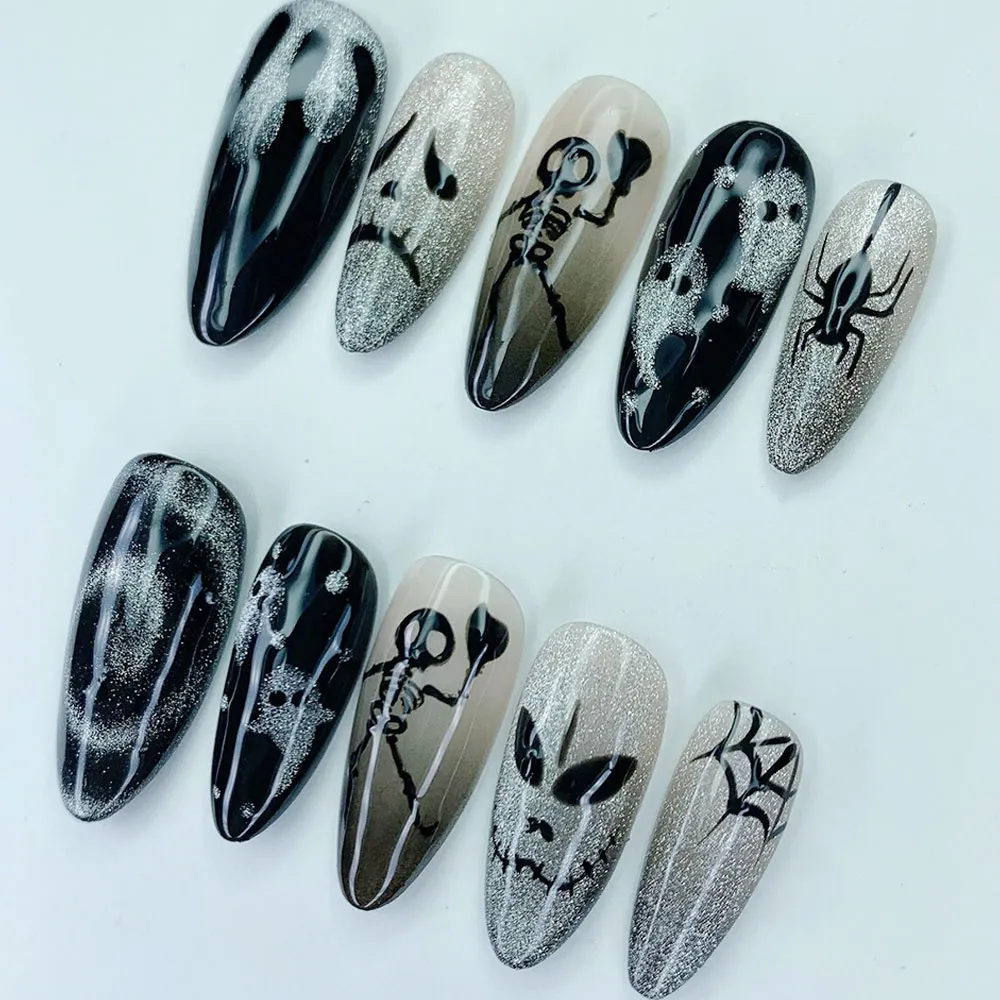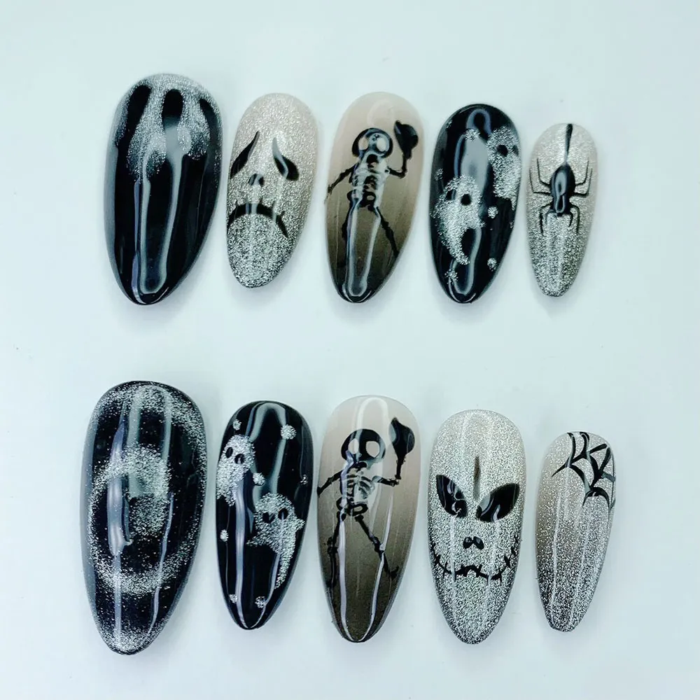Eerily elegant and hauntingly gorgeous — these Halloween Ghost Skeleton press on nails bring the spooky season to life in the most stylish way possible. Featuring a moody black and silver palette with hand-painted horror characters, these fake nails are the perfect finishing touch for anyone who takes Halloween seriously. Subtle enough to wear anywhere, spooky enough to turn every head.