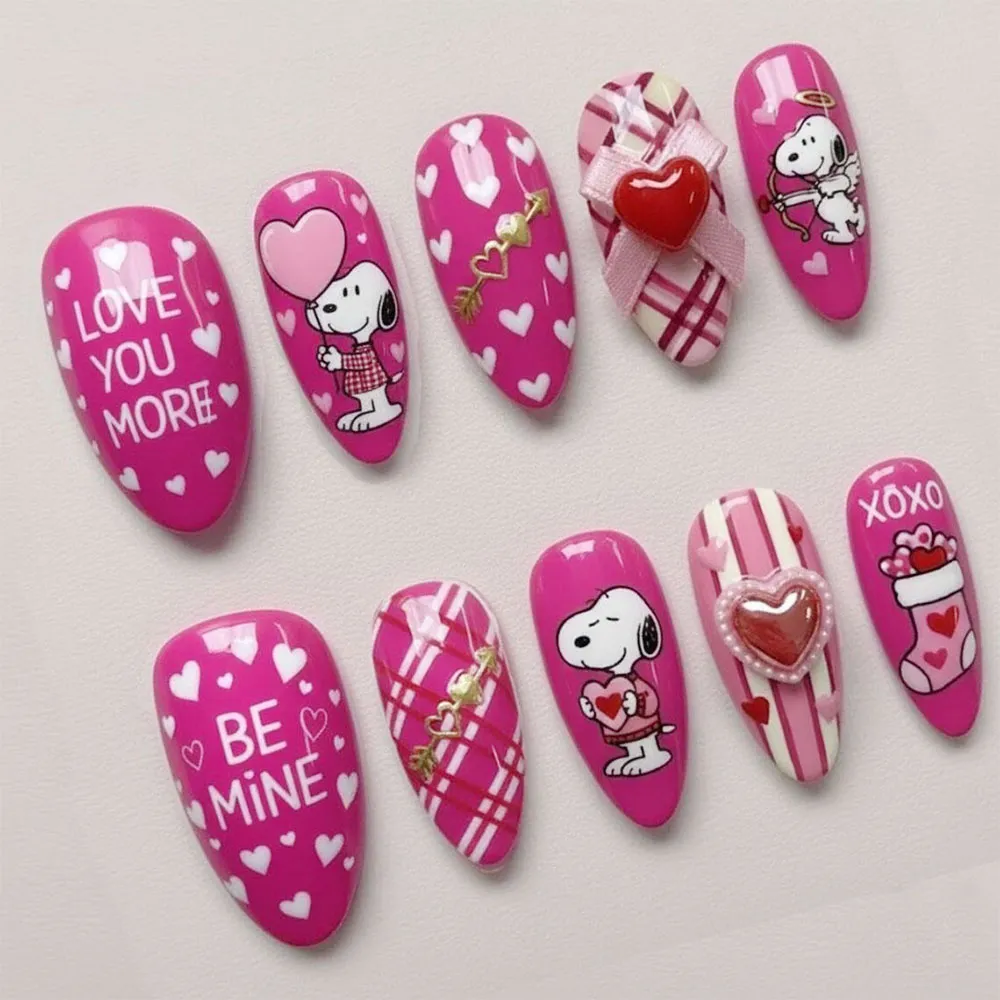 This show-stopping set features an irresistible mix of hand-painted designs on a vivid magenta-pink base: “Love You More” and “Be Mine” lettering nails scattered with white heart outlines for that sweet conversation-heart vibe; an adorable cartoon dog character holding a pink heart balloon and wearing a plaid outfit; a gold cupid arrow charm nail with heart detail; a plaid tartan pattern nail in pink and white tones; a 3D red heart with a pink ribbon bow accent; a cartoon angel dog shooting a love arrow; a Snoopy-inspired character holding a big red heart in a pink sweater; a pink and white stripe nail with a 3D pearl-rimmed heart gem centerpiece; and an XOXO nail featuring a holiday stocking filled with hearts and gifts. Every nail is finished in a high-gloss coating that makes the hot pink pop with maximum impact and joy.