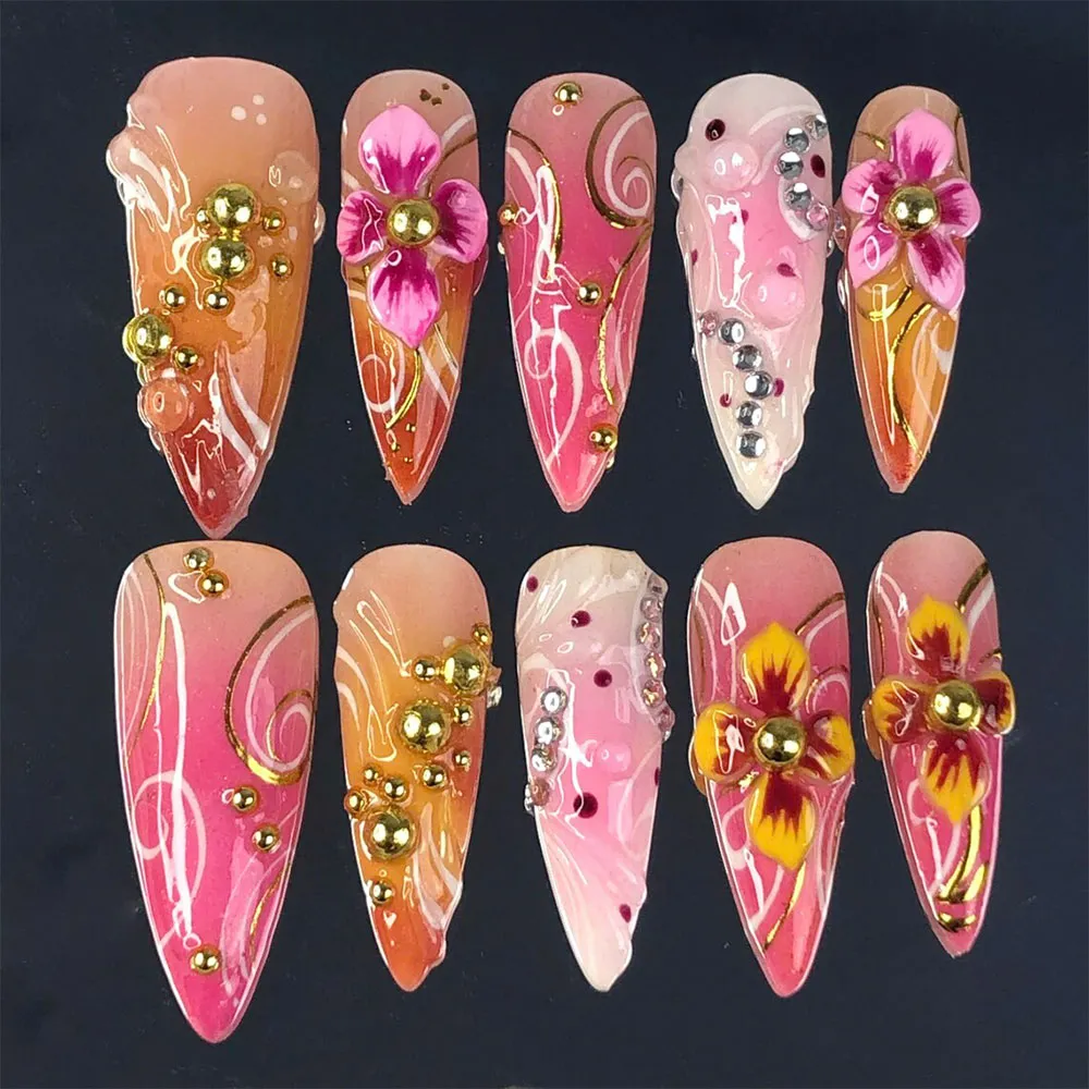 Every detail on this press on nails set is crafted with maximum drama in mind. Fluid white swirl brushstrokes and gold metallic vine lines flow elegantly across the gradient base, giving each nail a hand-painted, artisanal quality. Clustered gold ball bead accents in varying sizes are arranged in organic, grape-like formations that add rich 3D texture and a luxurious jewel-toned finish. The accent nails feature stunning 3D floral blooms — one in vivid fuchsia pink and another in deep golden yellow with burgundy detailing — both sculptured with remarkable petal depth and dimension. Silver crystal rhinestones on the softer pink nails add a cool contrast sparkle, while dark wine-red dot accents scattered across select nails add a moody, editorial edge to the collection. The glossy finish on all these fake nails makes the colors pop with intense, saturated vibrancy.