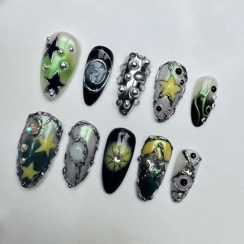 Each set is lovingly handmade with a warm brown base adorned with hand-sculpted 3D gold chrome accents that gleam with a mirror-like brilliance from every angle. Delicate star motifs and sparkle details are woven through the design with the precision and intentionality that defines Japanese nail art at its most elevated — every element perfectly placed, every detail meticulously crafted. These fake nails deliver a flawless, salon-quality gel finish that captures the warmth of the fall season while radiating an unmistakable golden luxury.