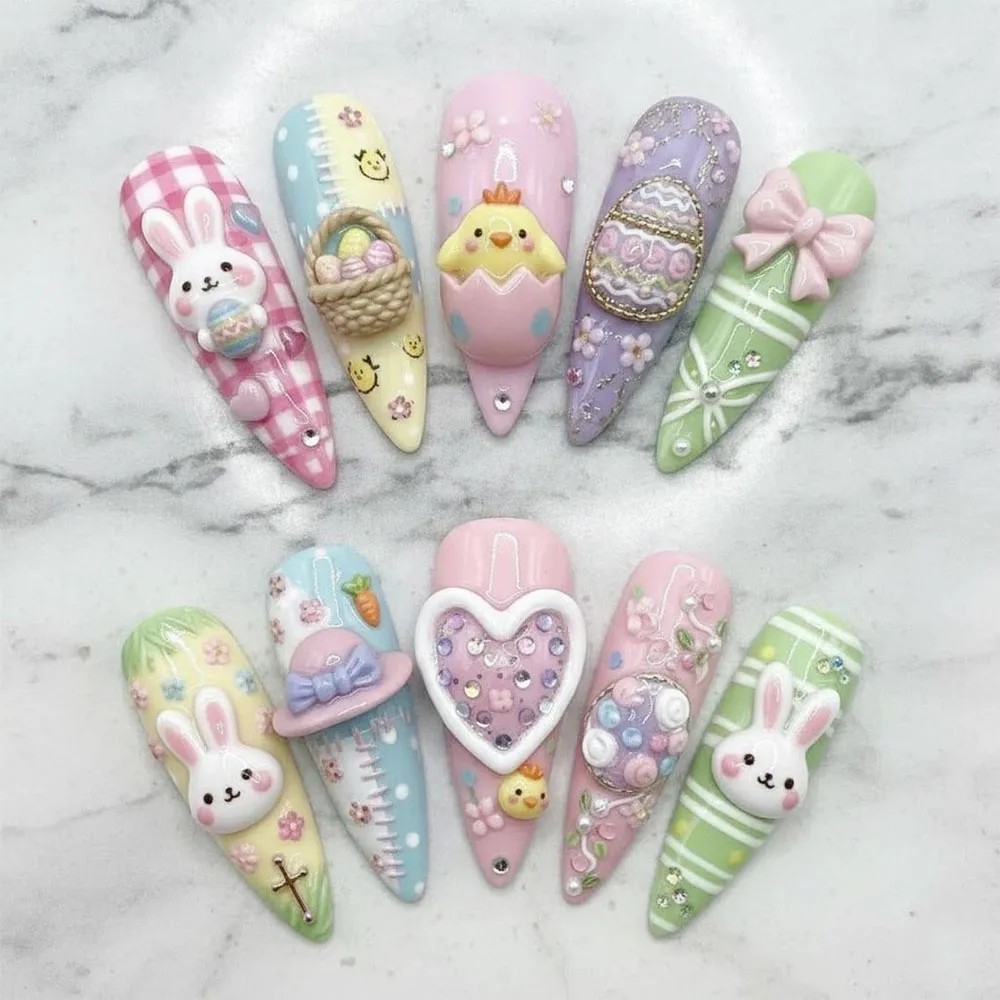 Every single nail in this collection is a miniature work of art. A 3D white bunny holding a pastel Easter egg sits on a pink gingham check background, a woven basket overflowing with colorful eggs steals the show on butter yellow, a baby chick hatching from a pink egg is surrounded by tiny rhinestones, a shimmery Easter egg with gold trim gleams on soft lavender, and a chunky 3D pink bow anchors a sage green striped nail with pearl details. The second row goes even bigger — a giant 3D bunny face on yellow with a cross charm, a bunny in a lilac bow hat on polka dot blue, a heart-shaped shaker filled with iridescent gems on blush pink, a floral Easter egg with rose details and a chick on pink, and a bold 3D bunny on pastel green stripes. The color palette spans pink, lilac, sage green, baby blue, butter yellow, and blush — a full Easter rainbow in one stunning set. These press on nails pack rhinestones, glitter, shakers, bows, pearls, and sculpted characters into every nail for maximum impact.