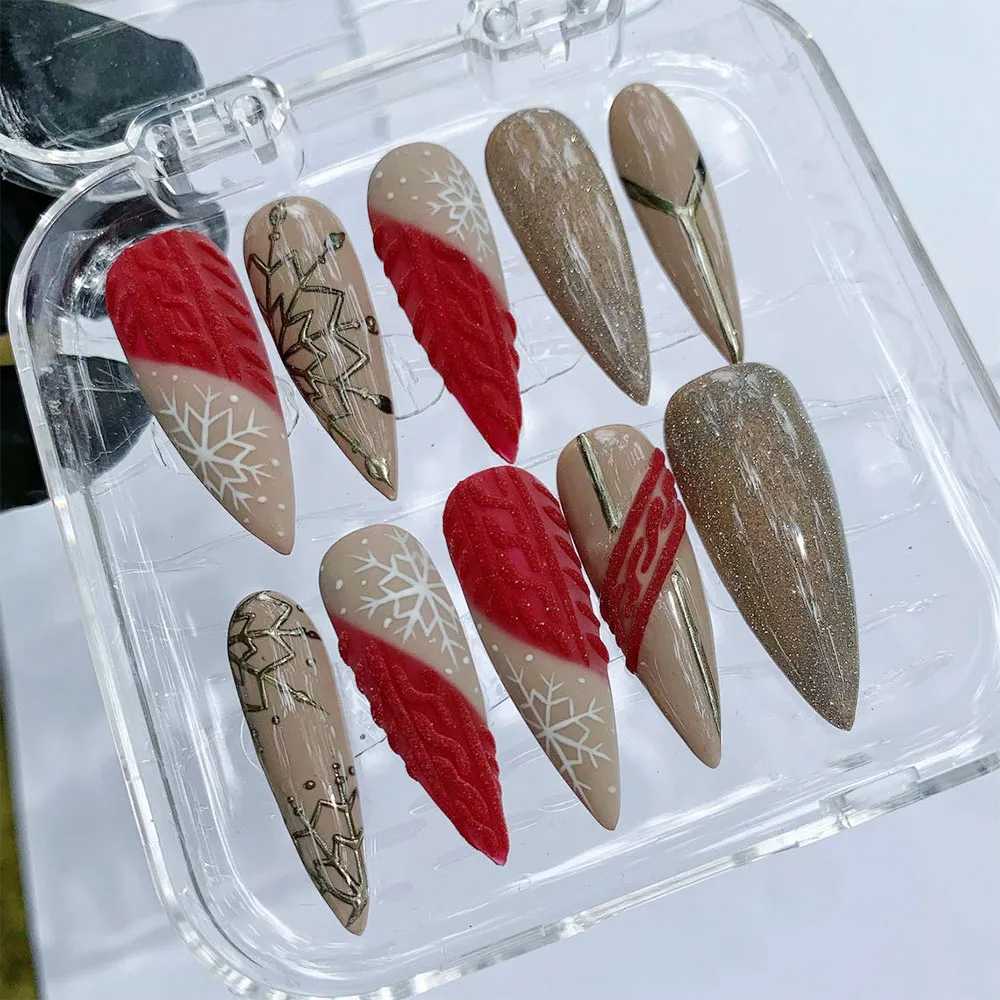 Cozy meets chic this holiday season with these sophisticated red and mocha Christmas press on nails — a set that brings together tactile cable knit textures, hand-painted snowflakes, and gleaming gold metallic accents for a look that’s warm, stylish, and undeniably festive. These fake nails are the perfect blend of winter comfort and runway-ready glamour.