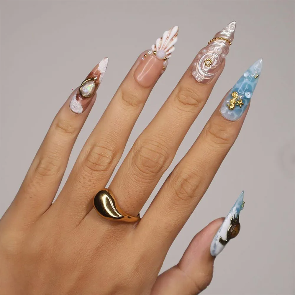 Opulent, rare, and utterly magnificent — these luxury ocean press on nails are the most refined coastal nail set of the season. A sophisticated palette of blush nude, champagne gold shimmer, soft sky blue, and warm terracotta creates a rich, museum-worthy canvas across the full set, making these fake nails feel less like nail art and more like a wearable fine jewelry collection inspired by the deep sea. This is the ultimate summer nail set for the woman who demands extraordinary.