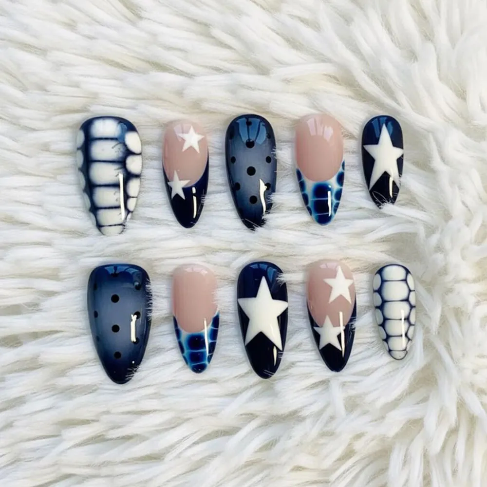 Cool, bold, and effortlessly edgy — these navy blue Y2K press on nails are a striking mix of graphic star motifs, tie-dye textures, polka dots, and nude French tips that come together in a set that feels both streetwear-ready and undeniably chic. This is the manicure for girls who keep it cool without trying.
