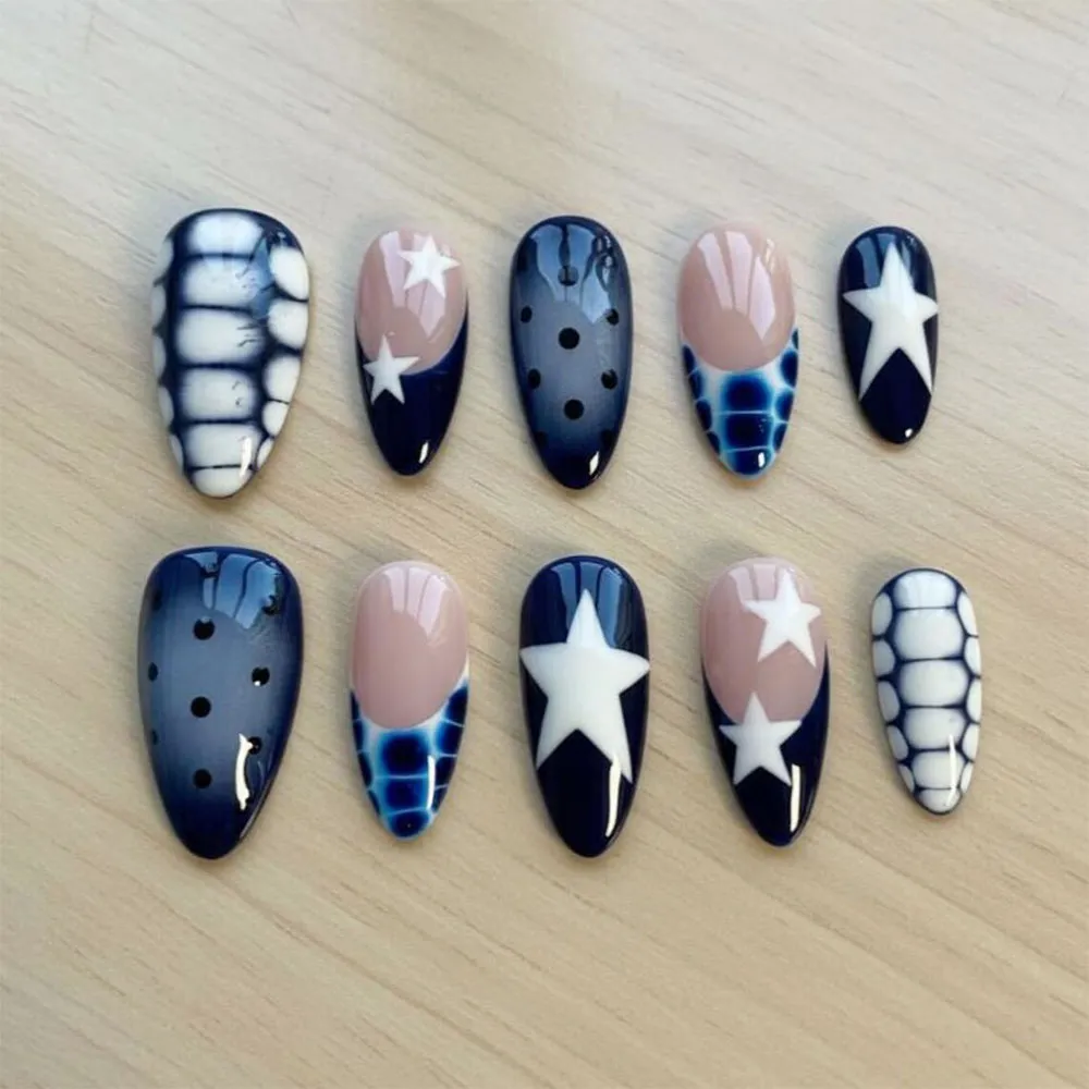 This cohesive yet dynamic set is built around a deep navy and white colour story that feels fresh, graphic, and modern. A navy tie-dye nail with organic white and blue bleeding patterns opens the collection with an artsy, washed-ink energy that channels shibori textile art on a miniature scale. A nude French tip nail with a bold white star painted across the tip brings a clean, graphic Y2K moment that is instantly recognisable and effortlessly cool. A deep navy nail with a scattered black polka dot pattern adds a playful, retro texture that breaks up the intensity of the darker nails beautifully. A navy nail with an electric blue crocodile or grid-like scale texture gives the set an unexpected material-inspired detail that feels fashion-forward and tactile. A full navy nail with a large centred white star is the graphic anchor of the set — bold, simple, and iconic. The second row revisits and expands each design, pairing the polka dot navy nail, the blue scale texture French tip, the large white star nail, the star French tip, and a sheer white base nail with dark blue web or grid line detailing for a final abstract art finish. All nails are finished in a high-gloss gel shine.