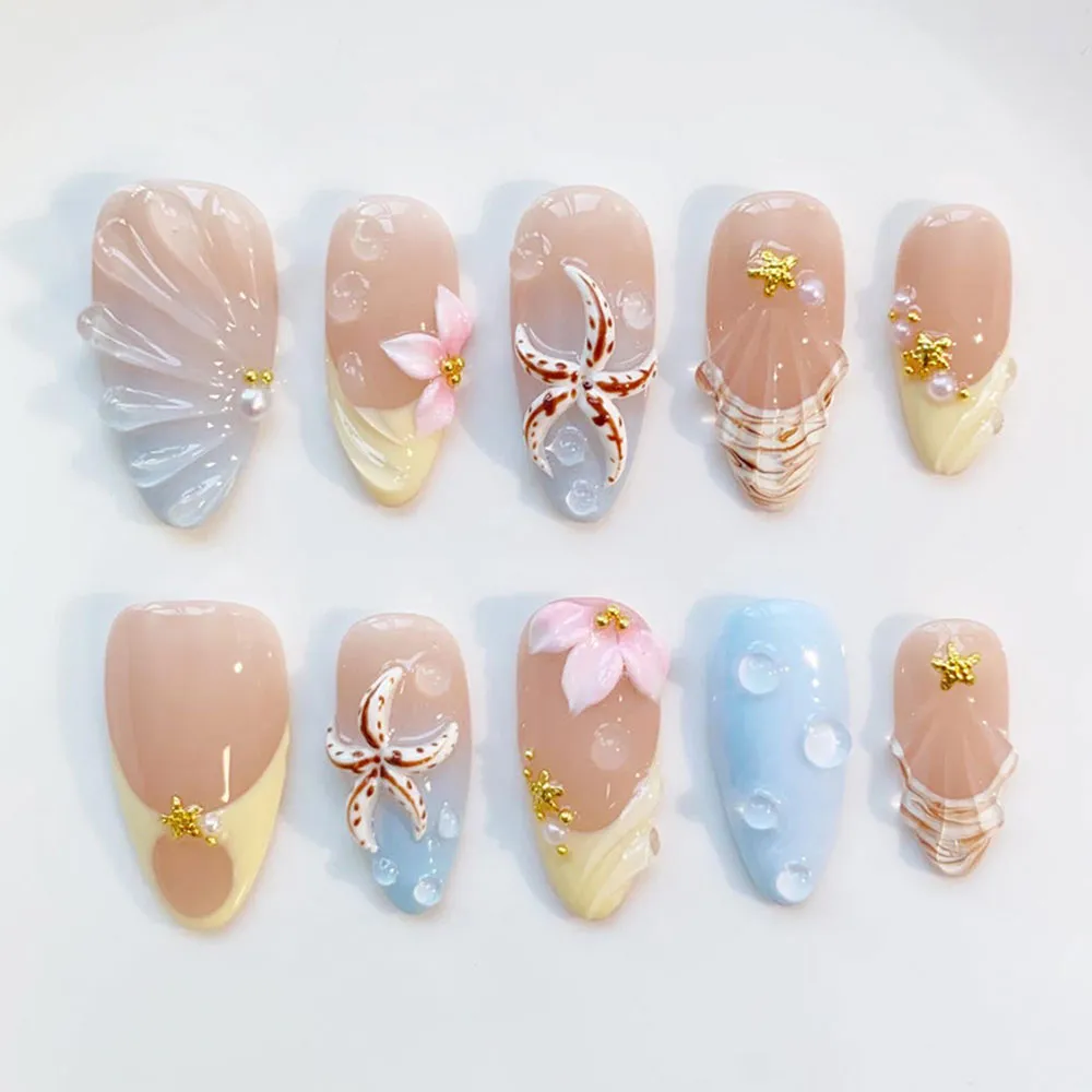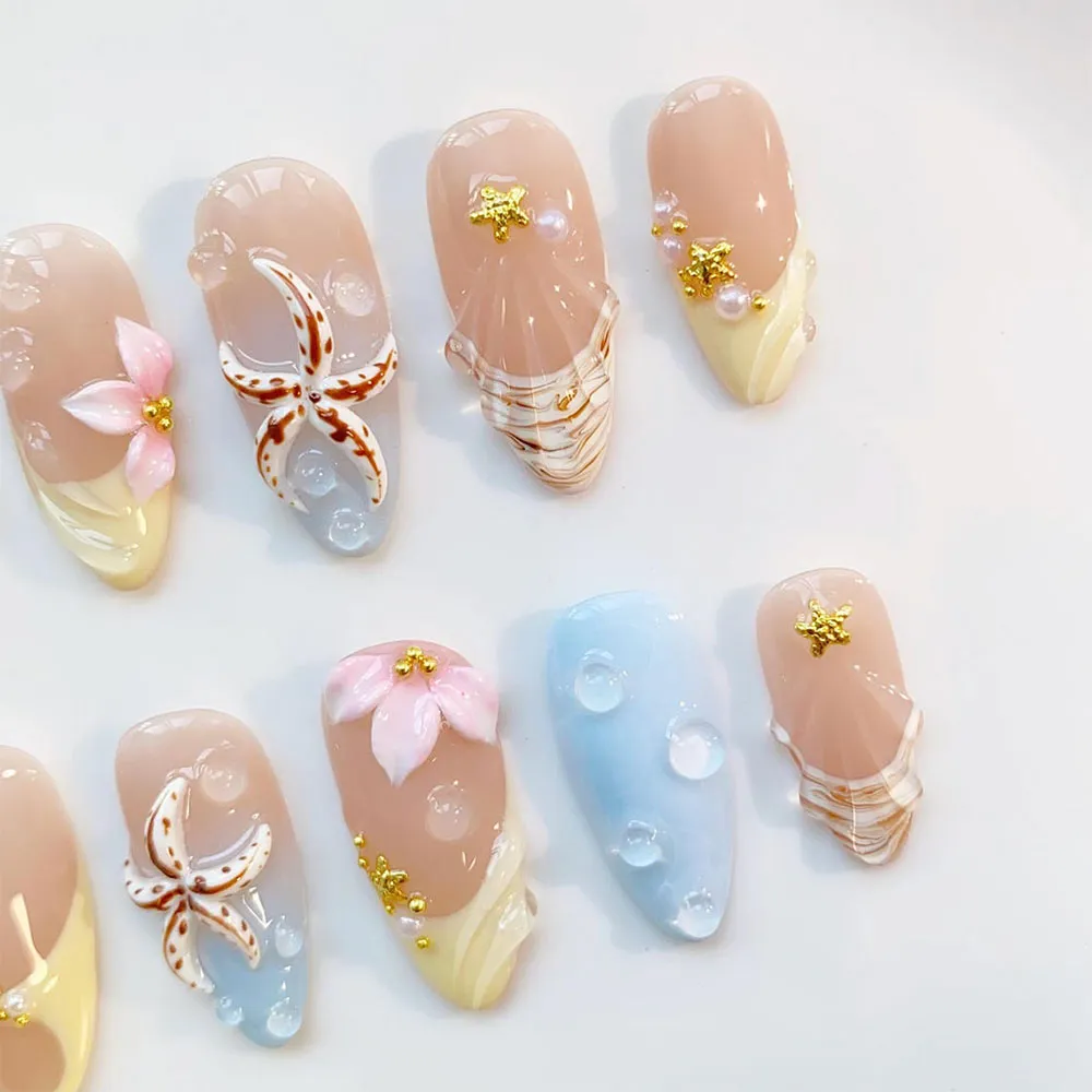 The artistry packed into this press on nails set is exceptional in both variety and detail. The showstopper accent nail features a highly realistic 3D starfish charm rendered in natural brown and white with intricate spot detailing — so lifelike it looks like it was plucked straight from a tide pool. A soft pink 3D floral bloom with a gold bead center rests delicately alongside the starfish on a nude-to-blue gradient base, adding a romantic feminine contrast to the coastal theme. Multiple nails showcase sculptured shell fan reliefs — one in a dreamy blue-to-nude ombré with pearl accent, another in warm champagne tones with fine striated lines — each one glowing with a glossy, glass-like finish. Transparent bubble gel texture on the soft blue nails mimics the look of water droplets and ocean foam, while gold mini starfish charms and pearl bead accents add refined finishing touches across the full set. These fake nails are a complete coastal treasure collection.