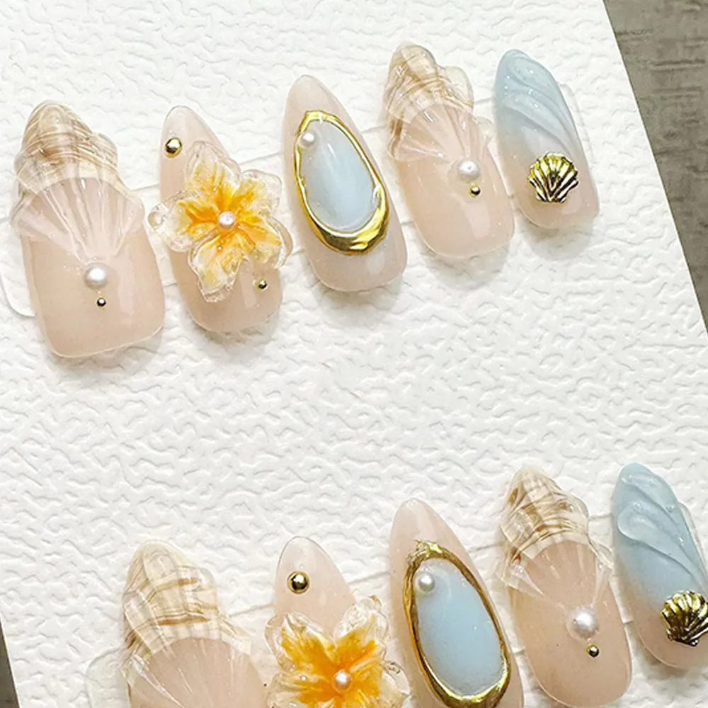 The craftsmanship on this press on nails set is nothing short of museum-worthy. Sculptured shell fan reliefs in sheer translucent ivory and warm champagne flow across multiple nails with remarkable realism — fine ribbed lines and gentle curves that catch light exactly the way real shells do on a sun-warmed shore. The crown jewel of the set is a gold-framed abalone stone nail featuring an oval iridescent blue-grey stone set within a thick molten gold border and topped with a lustrous white pearl — an absolute statement of refined luxury. A 3D golden yellow floral bloom with delicate layered petals and a pearl center adds a warm romantic accent, glowing against the nude base like a summer wildflower. A textured gold scallop shell charm and soft aqua blue wave-texture accent nail introduce subtle color contrast, while gold micro-ball beads scattered across multiple nails add precise finishing touches of warmth. These fake nails are a complete jewelry collection for your fingertips.