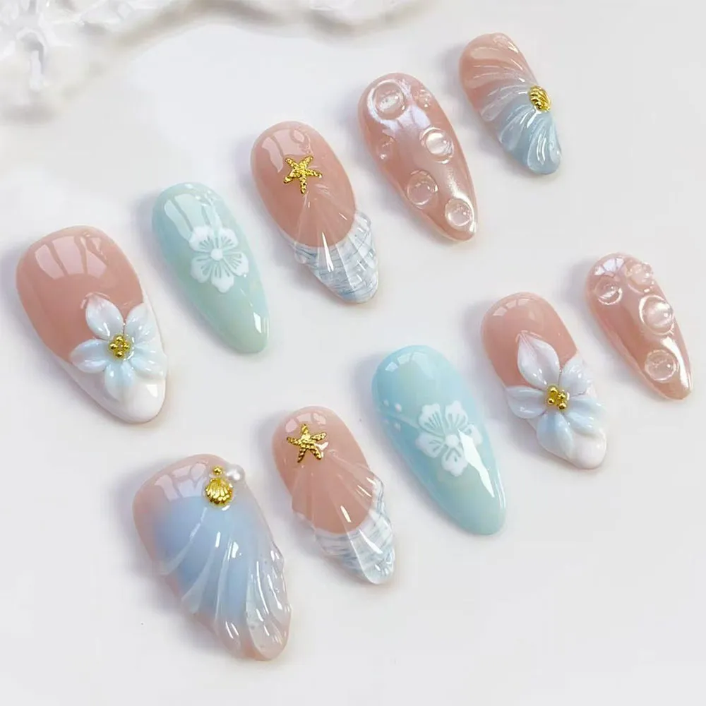 Each nail in this stunning press on nails set is a tiny work of art. The design features a delicate soft ombré base blending warm nude-pink and cool aqua-mint tones, finished with a luminous glossy shine that mimics the shimmer of pearls beneath sunlight. Dreamy 3D white floral blooms sit elegantly at the center, paired with intricate shell and starfish gold charms that elevate the whole look. Transparent bubble gel textures add a playful, almost underwater feel — giving these fake nails serious mermaid-core aesthetic energy. The aurora shimmer finish across several nails catches light beautifully from every angle, making these press-ons impossible to ignore.