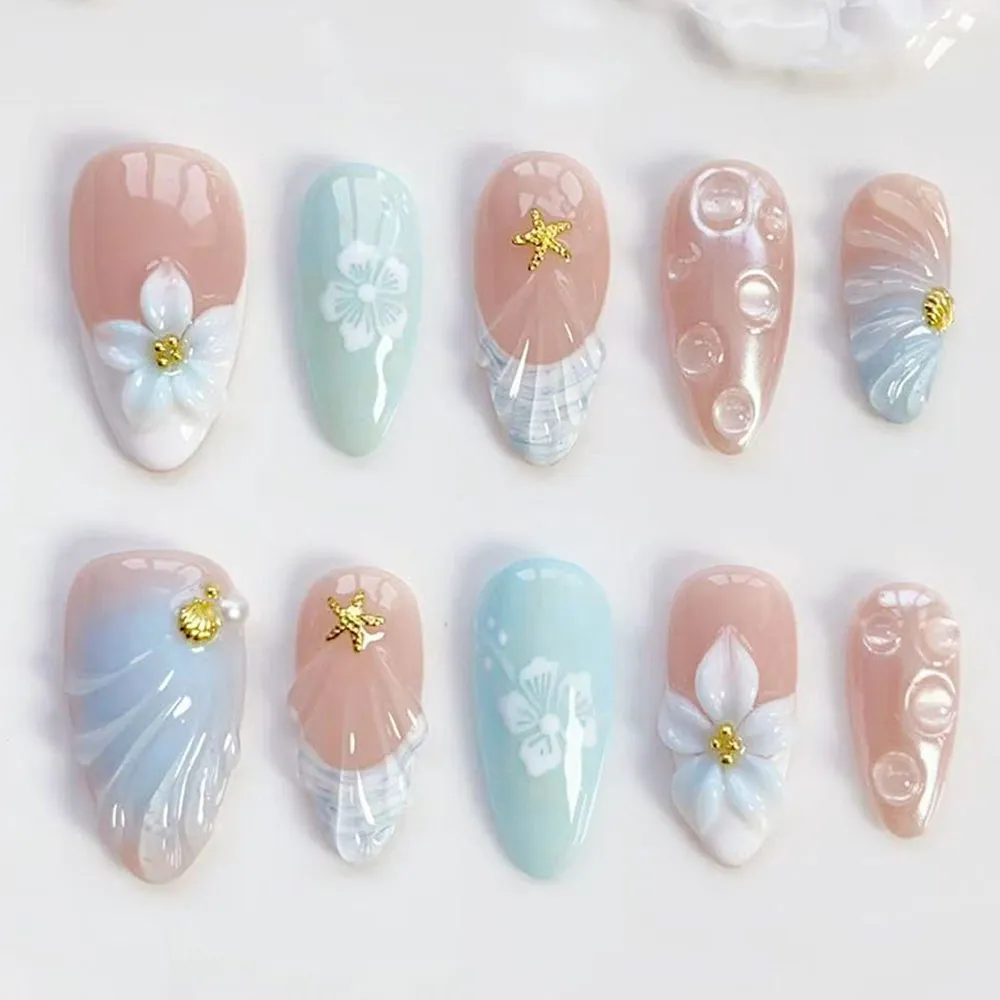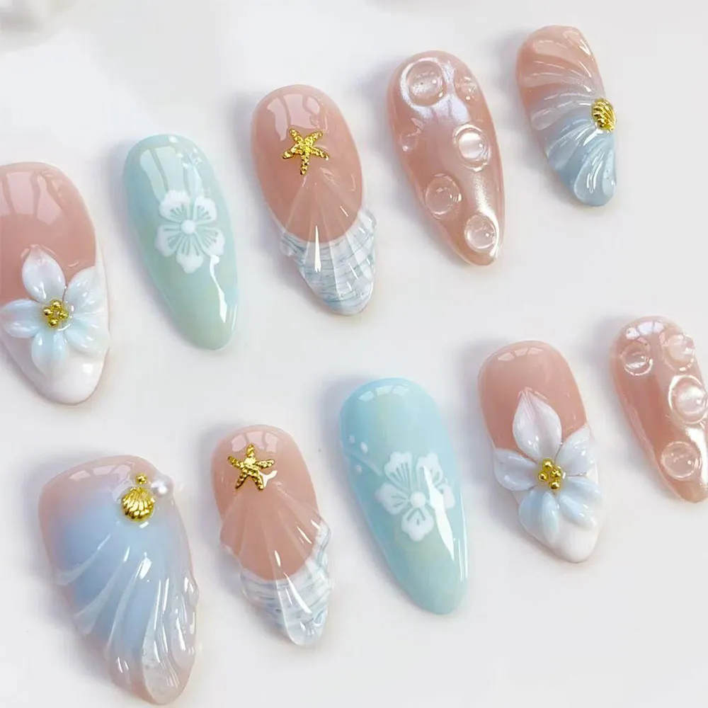 Upgrade your nail game without the salon price tag — order your ocean floral fake nails today and bring the beach to your fingertips!