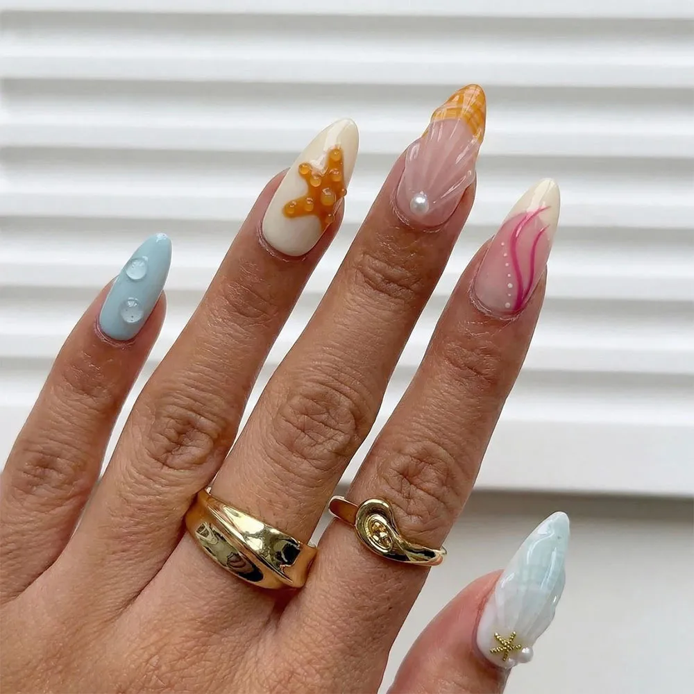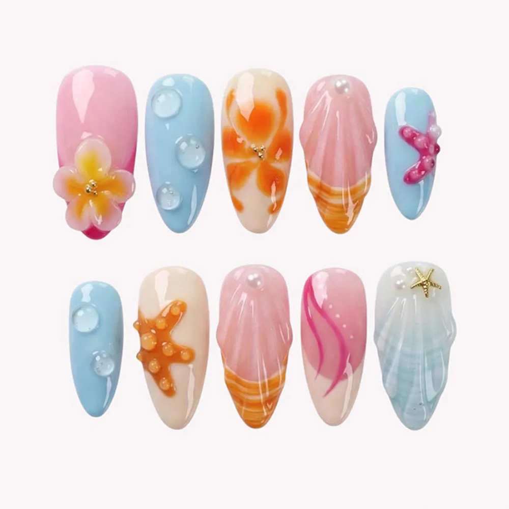The design on this press on nails set balances fun and artistry in perfect harmony. A standout 3D plumeria flower bloom in warm yellow and orange with a crystal bead center sits beautifully against a soft pink base, bringing a tropical garden feel to the collection. An orange 3D starfish charm with textured dot detailing glows vividly on a peachy cream nail, while a smaller hot pink starfish charm pops with color on the powder blue accent nail, and a gold mini starfish with pearl bead companions adds elegant coastal sparkle on a crisp white shell nail. Transparent bubble gel water droplets in clear blue scatter across the aqua nails like freshly splashed ocean water. Hand-painted orange hibiscus on a creamy base and sculptured shell fan reliefs — one in warm orange-peach stripe tones, another in soft sky blue, and a third in translucent white — complete the coastal art collection with stunning dimensional depth. A fuchsia swirl wave design on pink adds a bold artistic accent. These fake nails are a complete summer ocean gallery.
