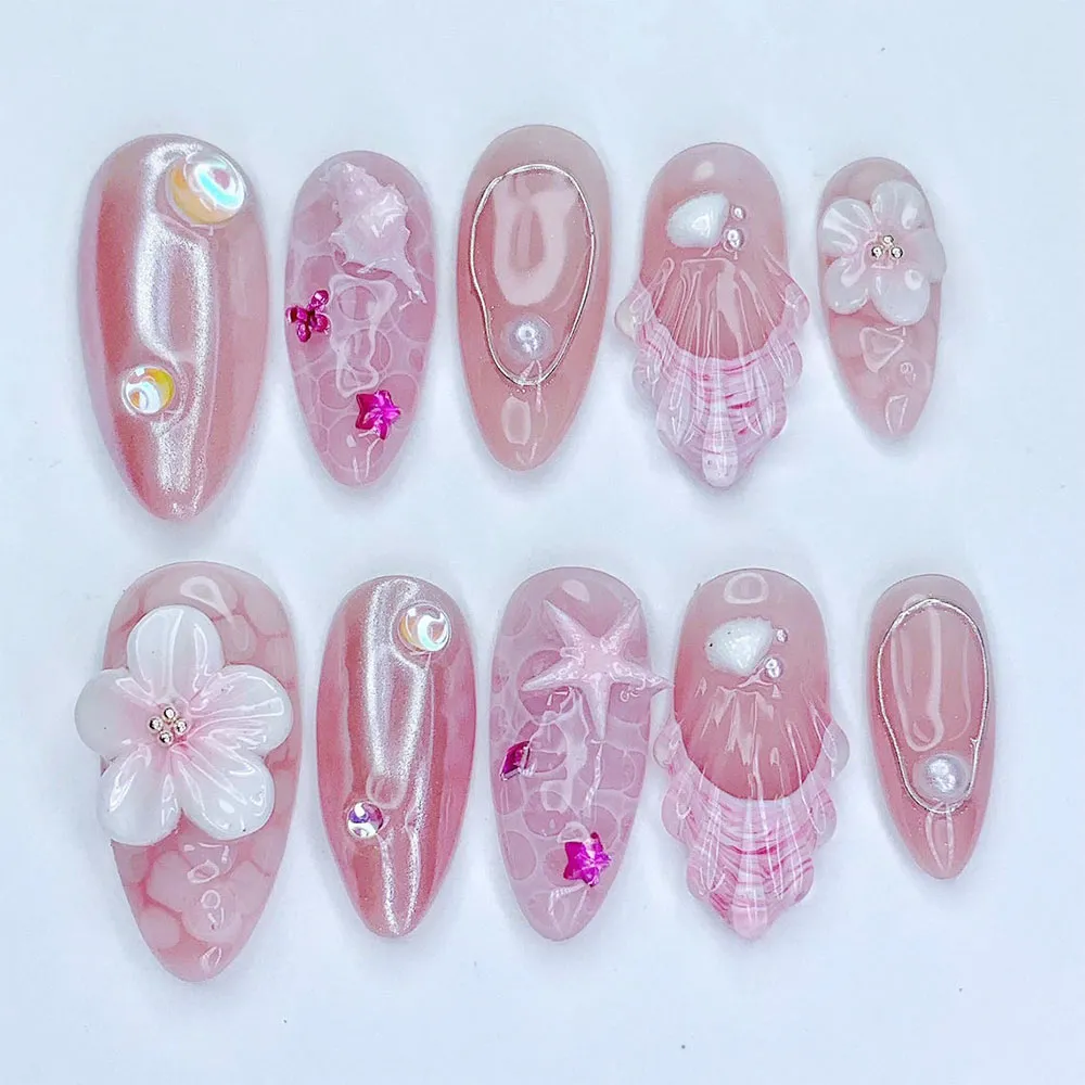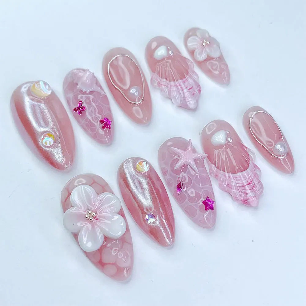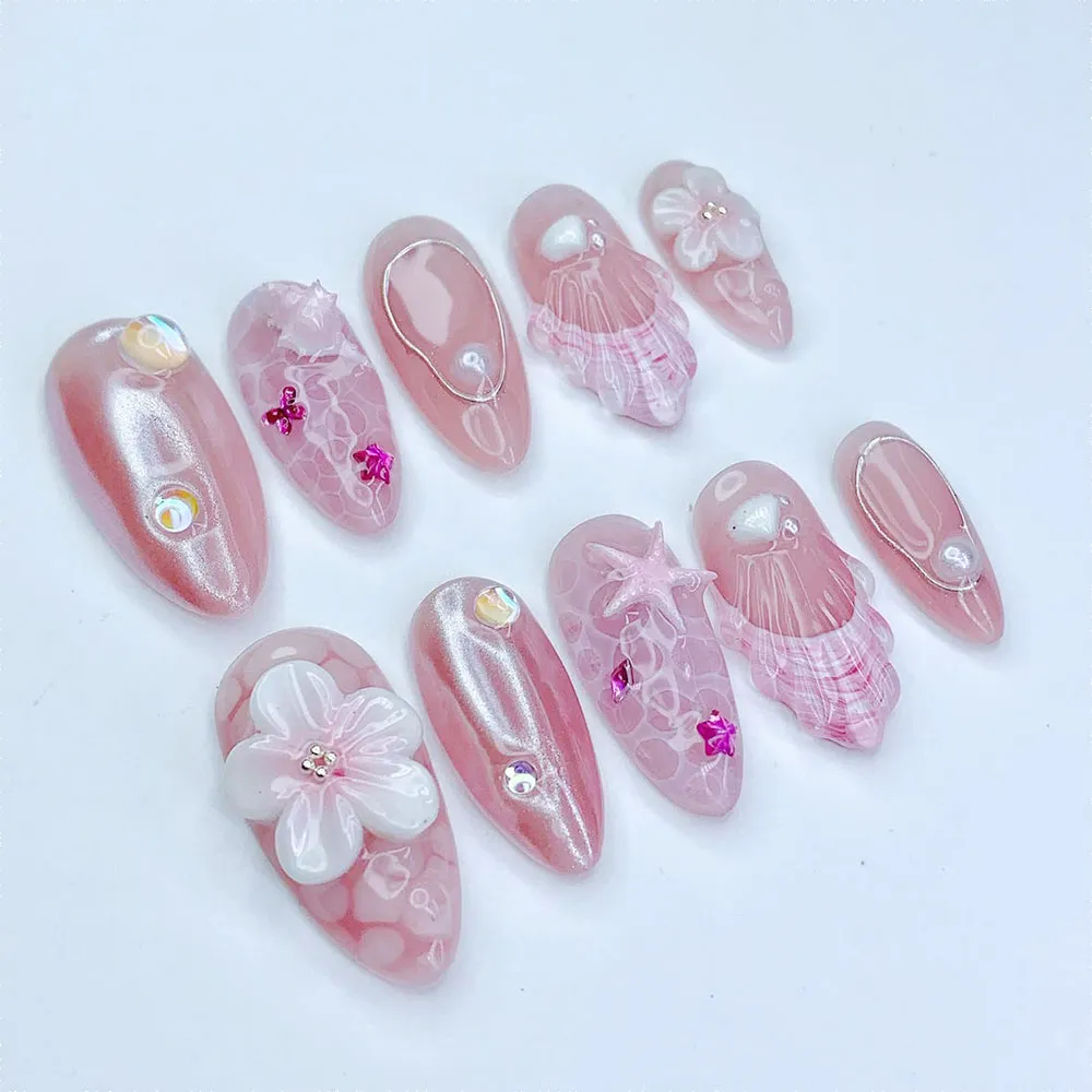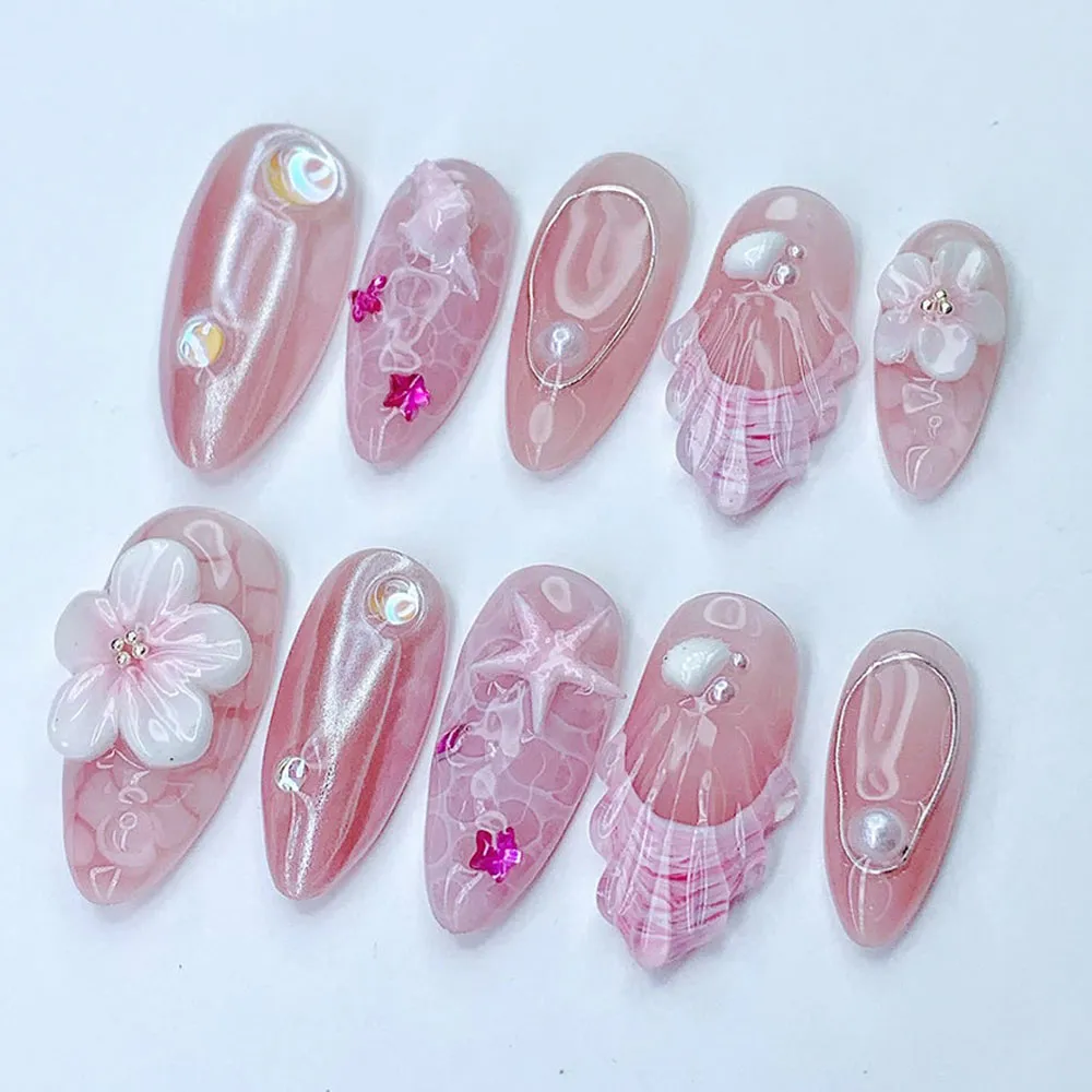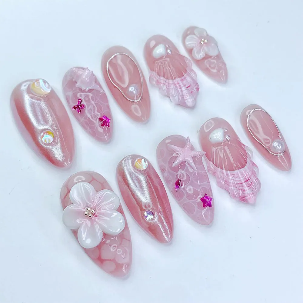 Every detail on this press on nails set feels intentional and exquisite. The standout accent nail features a large sculptured 3D white floral bloom — soft, layered petals with a delicate crystal bead center — sitting elegantly against the shimmering pink base for a romantic bridal-worthy touch. A translucent pink shell fan relief nail with intricate ribbed line texture and fuchsia pink stripe detailing adds stunning coastal dimension. The aurora chrome nails shimmer with iridescent AB bubble gems and fuchsia mini star charms scattered across the surface like fallen stardust. A rose gold wire teardrop frame with a floating pearl bead creates a refined minimalist jewel effect on two accent nails. A pink starfish outline etched across a swirling ocean-texture nail and scattered white shell motifs complete the full deep-sea story. These fake nails balance coastal charm with dreamy feminine luxury in every single detail.