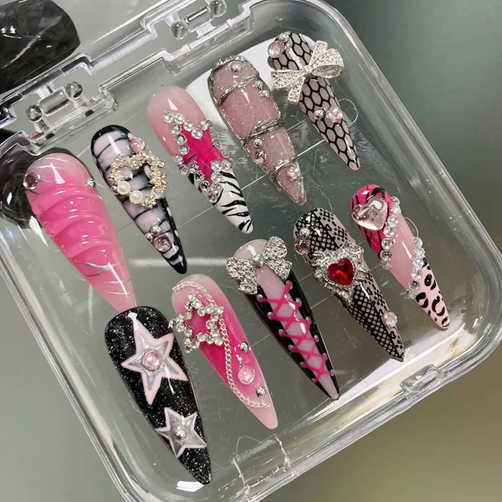 This jaw-dropping set is a maximalist dream loaded with texture, charm, and attitude from every angle. A hot pink swirl nail with silver line detailing and a scattered rhinestone accent kicks off the collection with electric energy, while a black and white zebra stripe nail topped with a stunning pearl and crystal brooch charm brings luxe editorial flair. A pink and zebra French tip nail scattered with oversized crystal gems channels early-2000s bling culture at its most glamorous. A dusty pink glitter nail with a silver coil ring wrap detail adds a sleek, modern edge, and a black honeycomb mesh nail crowned with a large 3D rhinestone bow charm is pure dark feminine perfection. The second row delivers even more drama: a black glitter nail with bold white and silver star motifs, a soft pink nail with a cascading rhinestone star chain charm, a black nail with a hot pink corset lace-up design and a 3D rhinestone bow, a mixed black mesh and pink leopard print nail with a 3D red crystal heart charm, and a pink and black swirl nail with leopard accents and a 3D transparent heart gem. All nails are presented in a clear acrylic display box and finished in a high-gloss gel shine.